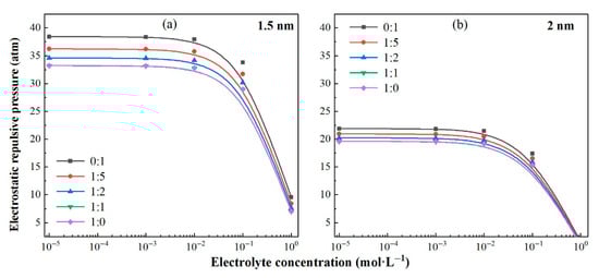 To clearly explore the changes in electrostatic repulsive pressure between particles of compound soils, we took particle distances of 1.5 nm and 2 nm as examples (Figure 3). Electrostatic repulsive pressure decreased systematically with higher soft rock amendment ratios at all tested electrolyte concentrations and interparticle distances. In soft rock-amended sandy soils, across the amendment ratios, electrostatic repulsive pressure decreased with both the increasing interparticle distance and the higher bulk electrolyte concentration. Similarly, 10−2 mol·L−1 emerged as the critical bulk electrolyte concentration governing electrostatic repulsive pressure across all five amendment ratios. Electrostatic repulsive pressure surged as bulk electrolyte concentration decreased from 1 to 10−2 mol·L−1 then plateaued, with a further reduction to 10−5 mol·L−1. In summary, the addition of soft rock material reduces the electrostatic repulsion between the compound’s soil particles.