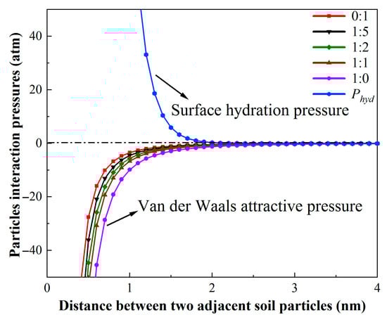 Here, positive and negative values denote interparticle repulsive pressures and attractive pressures, respectively. Surface hydration (Phyd) and van der Waals pressure (PvdW) can be calculated according to Equations (8) and (9), and the distributions are shown in Figure 4. Relative to unamended controls without soft rock, soft rock addition enhanced van der Waals attraction between compound soil particles. For two adjacent particles at 2.4 nm, the van der Waals attraction of five soils, with ratios of 0:1, 1:5, 1:2, 1:1, and 1:0, were −0.10, −0.19, −0.29, −0.38, and −0.71 atm, respectively, all showing net attractiveness. The hydration repulsive force decreased exponentially with the increase in the distance between particles. Moreover, for soil particles <2 nm, the repulsive force was greater than the attractive force. Furthermore, the disparity between the surface hydration repulsive forces and the van der Waals attractive forces escalated dramatically as the interparticle distance of soil particles diminished. This pronounced variation underscores the dynamic interplay between repulsive and attractive forces at the microscale, which significantly influences sandy soil particle aggregation behavior and colloidal stability. At interparticle separation distances >2 nm in soft rock-amended sandy soils, van der Waals attraction was significantly enhanced, and the sum of the van der Waals pressure and the hydration repulsive force between the compound’s soil particles is negative, showing an attractive force.