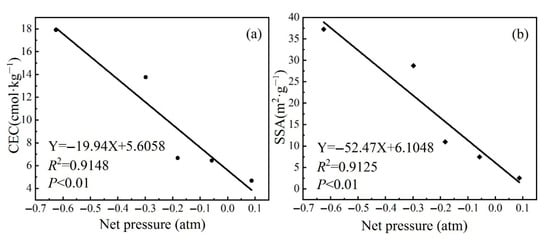 The net resultant force between the soil particles plays an important role in the formation of aggregate stability and the water and fertilizer conservation of compound soil. The cementation force between soil particles also reflects changes in the soil surface charge property and the internal particle interaction force, which have an important influence on improving the soil fertility and erosion resistance of aeolian sandy soil [16]. The results of this study found that the net interparticle forces exhibited significant negative correlation with specific surface area (SSA) and cation exchange capacity (CEC) in soft rock-amended sandy soils (CEC, R2 = 0.9148, p < 0.01; SSA, R2 = 0.9125, p < 0.01) (Figure 6). Due to the high content of clay and silt particles, soft rock materials have strong cation adsorption capacity and outstanding colloidal properties, containing up to 16.8~46.4% secondary clay minerals, as well as a large specific surface area [32,33]. In this study, with the incorporation of soft rock materials at different proportions, the CEC, SSA, and organic matter content of the compound soil increased continuously, and the net repulsive force between the compound’s soil particles became less attractive, which promotes an increase in the net attraction between the particles and an improvement in the structural stability of the compound soil.