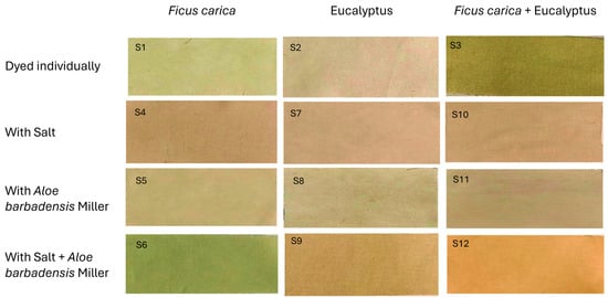 - Sample S12: dyed using a mixture of Ficus carica and eucalyptus extracts in the presence of both Aloe barbadensis Miller gel and salt.