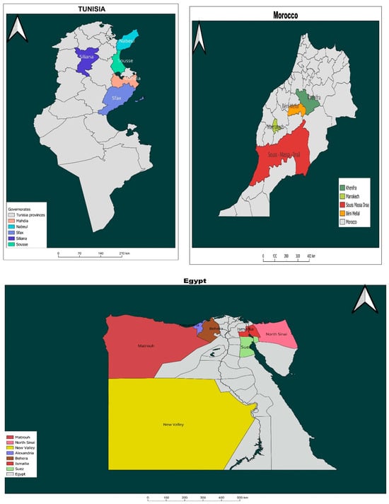 The study is based on the data collected in 2022 from 294 farm households in three countries in the MENA region: Egypt (112 households), Morocco (100 households), and Tunisia (82 households). Of the 29 governorates of Egypt, the study collected data primarily from New Valley, North Sinai, and Suez; however, some sample households were also from the Alexandria, Beheira, Ismailia, and Matruh governorates. Of the 12 regions defined by the Moroccan government since 2015, the data for this study were collected from four regions, viz., Souss-Massa, Draa-Tafilalt, Beni Mellal Khenifra, and Marrakesh Safi. Tunisia has 24 governorates. This study covered 6 governorates in its sample (