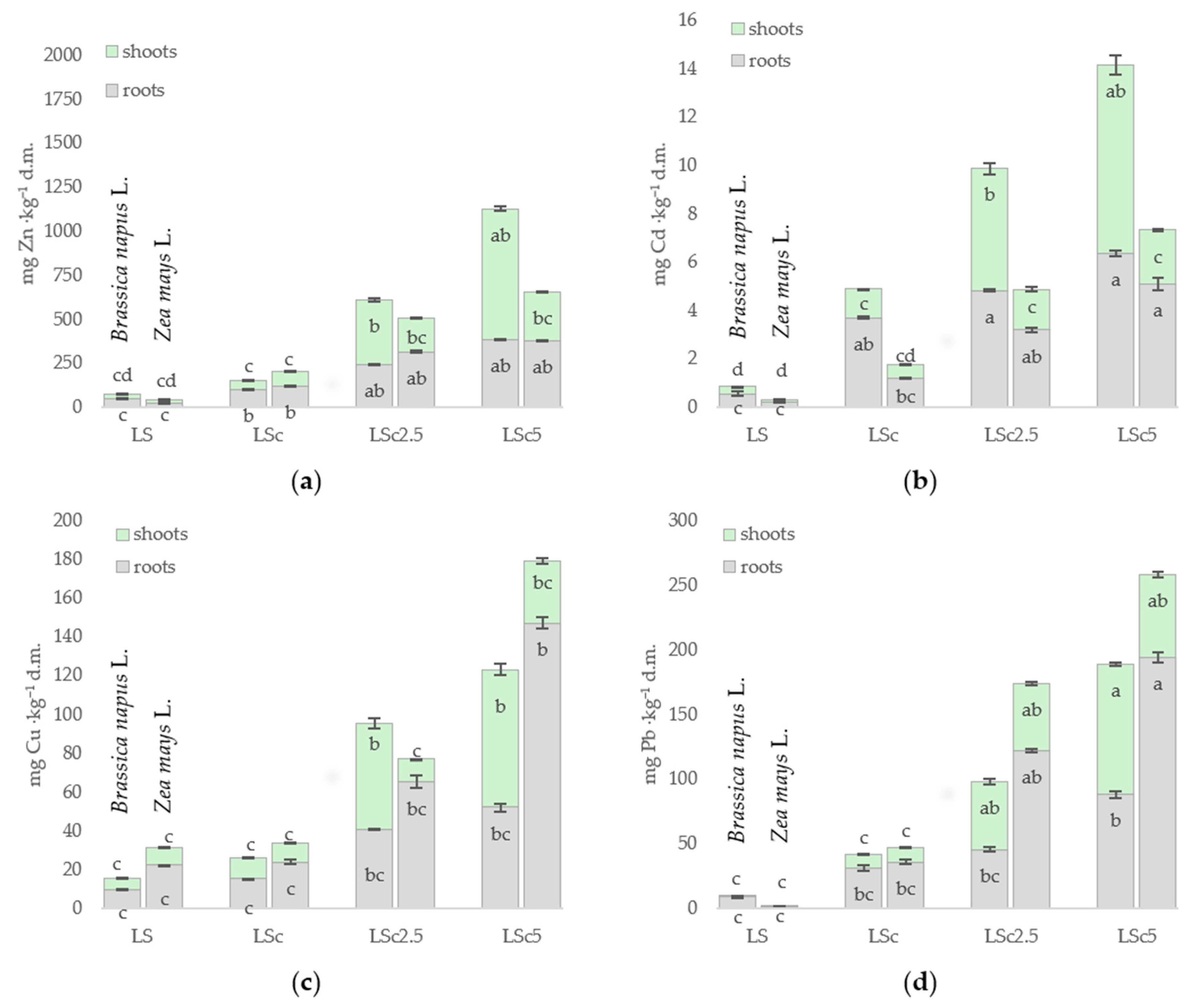 3.3. Metal Content in the Organs of Brassica napus L. and Zea mays L.