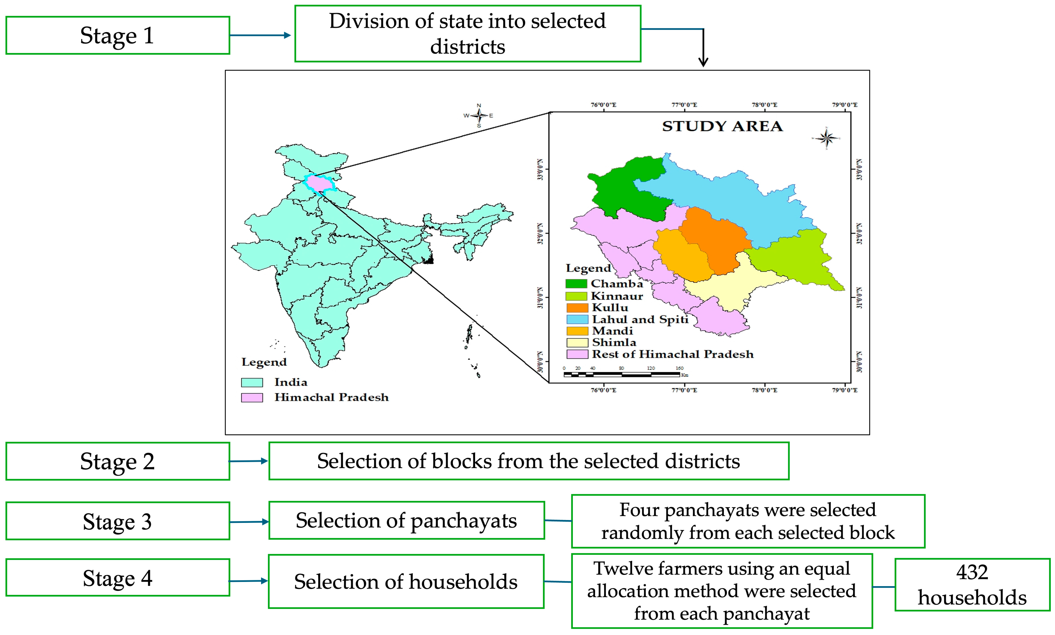 Finally, during the fourth stage, twelve farm households were selected from each panchayat using an equal allocation method, resulting in overall sample size of 432 farm households drawn from the total population of farming households residing in the selected panchayats across six districts. This sample size was considered adequate to reflect the dominant characteristics of the study population, including the prevalence of marginal, small and semi-medium farmers, mixed crop–livestock and horticulture-based farming systems, variations in farm size and income sources, access to institutional services, and exposure to climatic risks prevalent in the temperate regions of Himachal Pradesh.