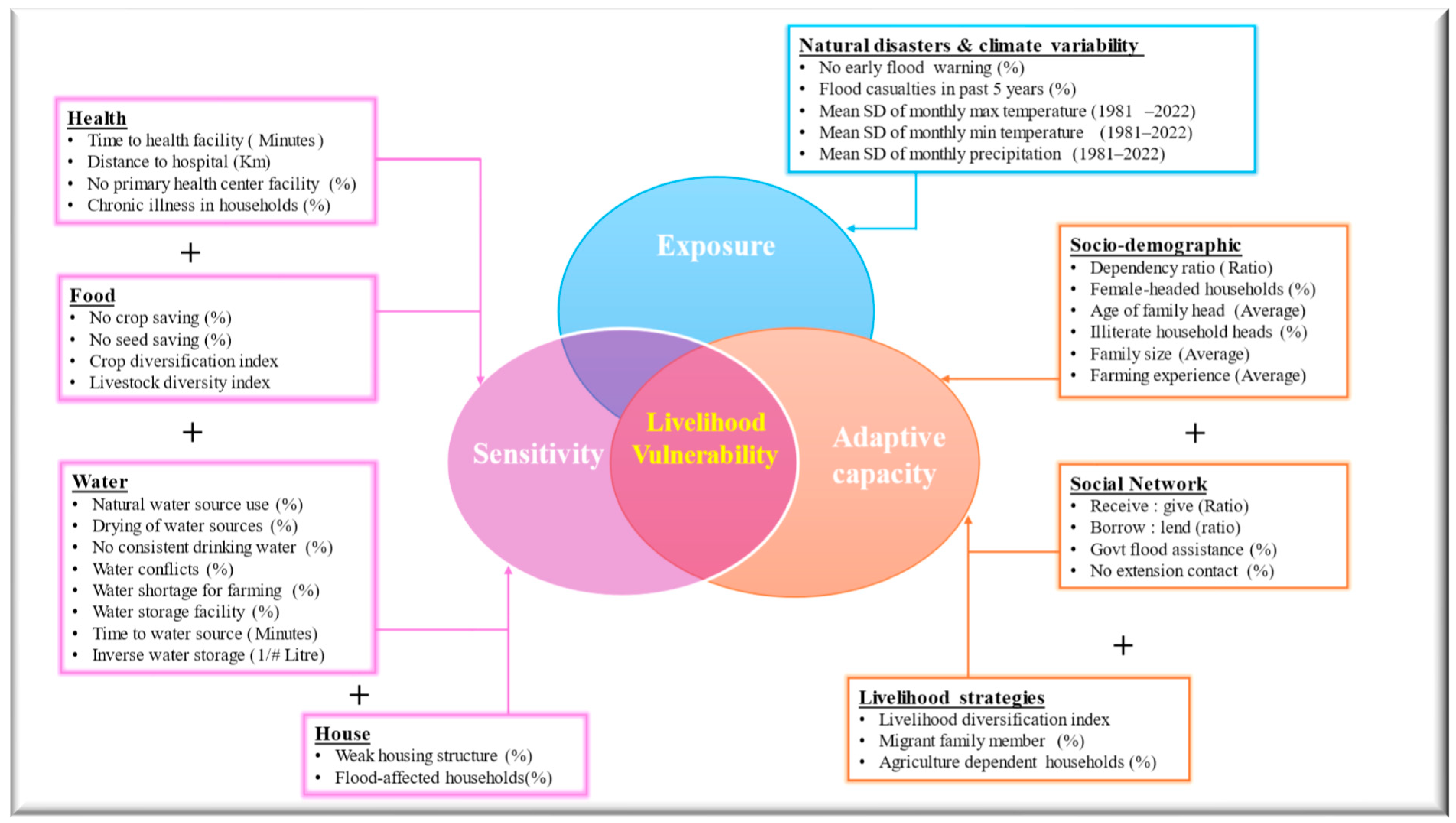 43], there remains limited quantitative evidence on its direct influence on specific components of the Livelihood Vulnerability Index, such as exposure, sensitivity, social networks, resource accessibility, and adaptive capacity.