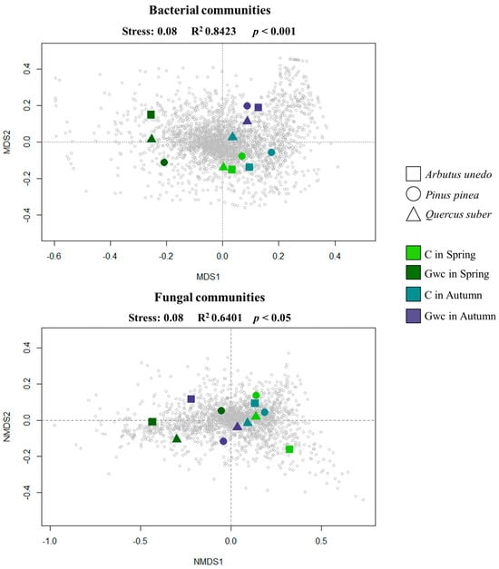 Two-dimensional Non-Metric MultiDimensional Scaling (NMDS) ordination based on classified Operation Taxonomic Units (OTUs) for both microbial groups, Bacteria and Fungi (stress value of 0.08) assessed for Plant Species (Arbutus unedo, Pinus pinea and Quercus suber), Season (Spring and Autumn), and Treatment (Control, C and Green-waste compost incorporation, Gwc). Colors represent the combination of Treatment × Season as mentioned in the label; shapes represent the three plant species studies.