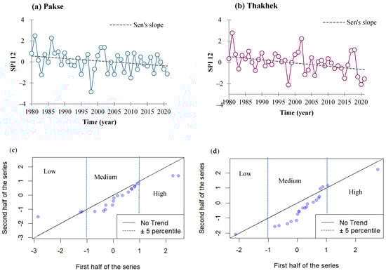 Trend Analysis of SPI-12 (1992–2021) using the MK Test and ITA Method at Thakhek and Pakse Stations. Subplots (a,b) present the results of the MK Test, and subplots (c,d) present the results of the ITA method. Results for Thakhek are shown in (a,c), and results for Pakse are shown in (b,d).