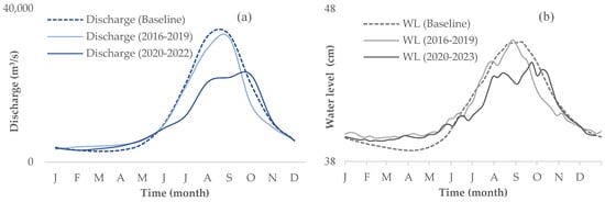 Changes in discharge (a) and water level (b) relative to baseline discharge and water level at Stung Treng station.