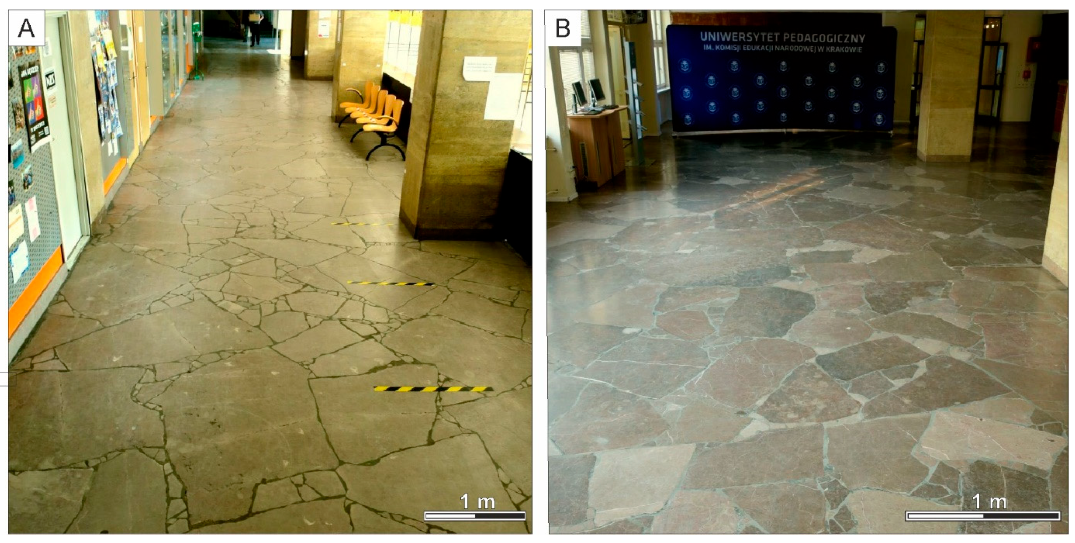 - Wolska, A.; Ciurej, A.; Kowalik, S. Wykorzystanie surowca naturalnego w wystroju wnętrza gmachu głównego Uniwersytetu Pedagogicznego im. Komisji Edukacji Narodowej w Krakowie (The use of a natural resource in the interior design of the main building of the Pedagogical University of Cracow). Biul. Państwowego Inst. Geol. 2018, 472, 339–348. [Google Scholar] [CrossRef]