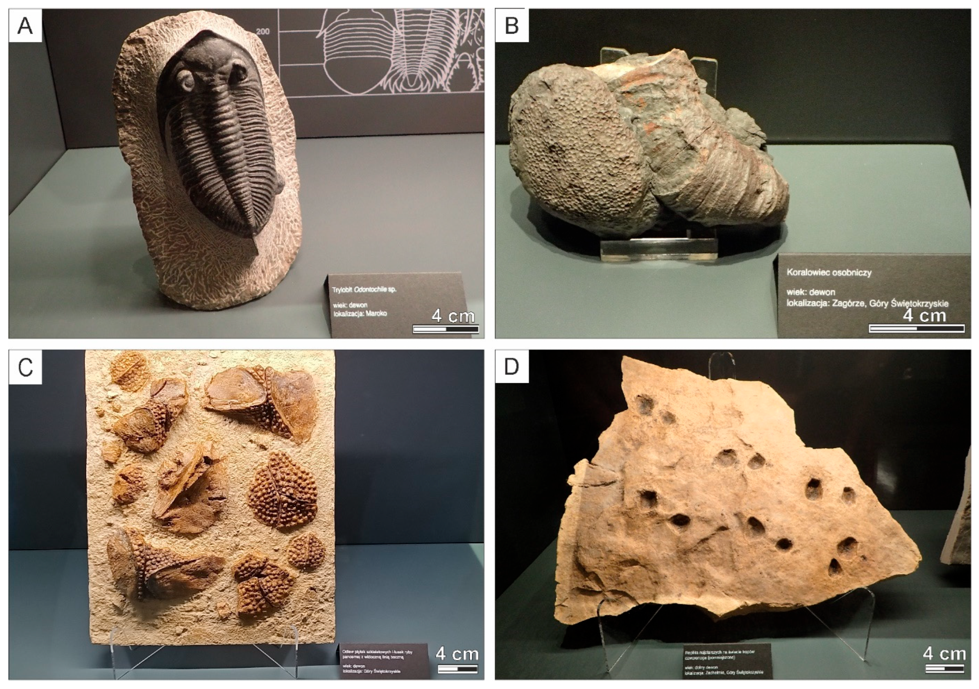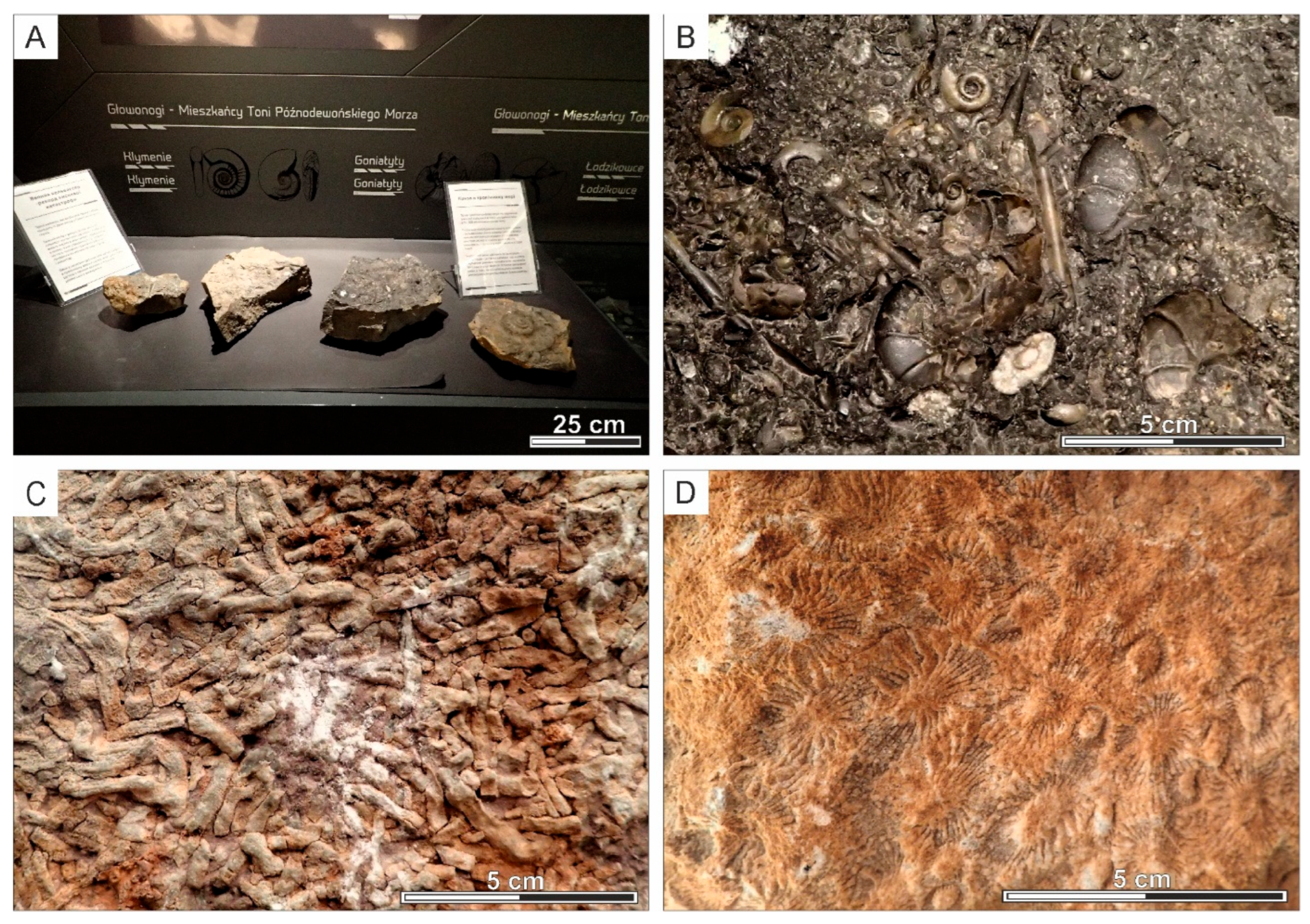 - Różkowska-Dembińska, M. Korale dewońskie Gór Świętokrzyskich. Wiadomości Muz. Ziemi 1949, 4, 187–220. [Google Scholar]
