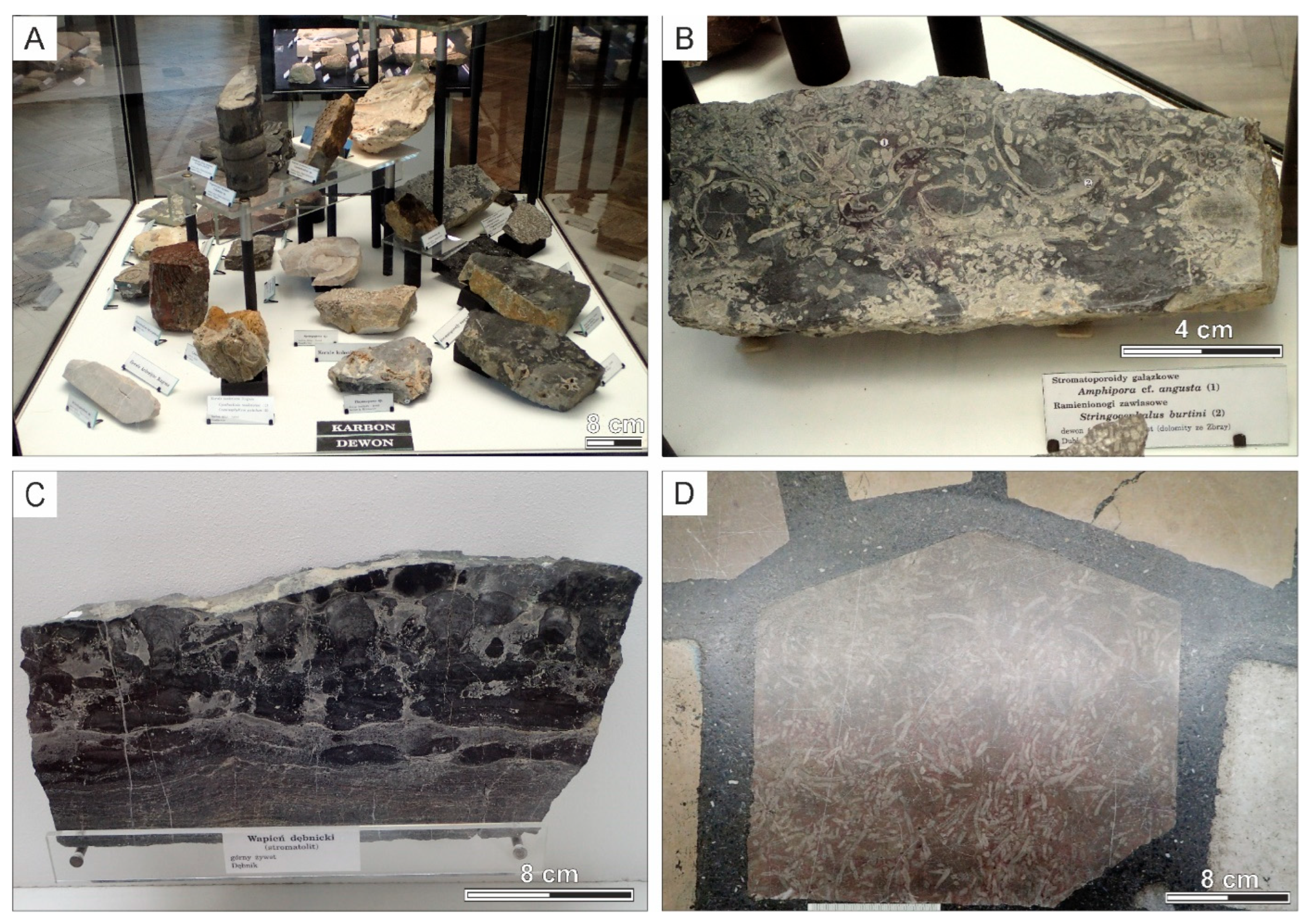 - Narkiewicz, M.; Racki, G.; Skompski, S.; Szulczewski, M. 2006—Zapis procesów i zdarzeń w dewonie i karbonie Gór Świętokrzyskich. In Materiały Konferencyjne. Przewodnik LXLVII Zjazdu Nauk. PTG; Skompski, S., Żylińska, A., Eds.; Ameliówka, Poland, 2006; pp. 51–77. [Google Scholar]