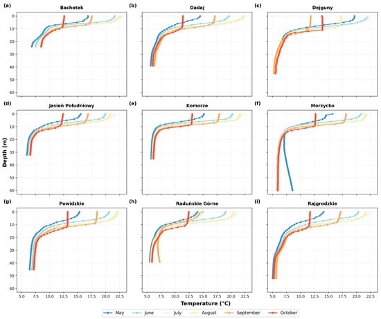 Month-to-month water-temperature variability (°C) for (a) Bachotek, (b) Dadaj, (c) Dejguny, (d) Jasień Południowy, (e) Komorze, (f) Morzycko, (g) Powidzkie, (h) Raduńskie Górne, and (i) Rajgrodzkie, respectively.