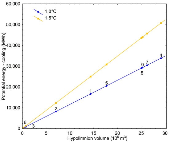 Figure 7 shows the relationship between the potential amount of energy [MWh] obtainable from the hypolimnion layer with water-temperature changes of 1.0 °C (blue line) and 1.5 °C (orange line). Given the similar temperatures of the deepest water layers in the individual lakes, the amount of heat depends primarily on the volume of this layer. This is a linear relationship determined by the amount of water stored in the hypolimnion. The primary factor determining the possibility of energy extraction from individual lakes is the volume of the hypolimnion. In the studied lakes, the ratio of the hypolimnion volume to the total volume of the lake basin ranged from approximately 2% in Lakes Bachotek and Jasień to about 29% in Lakes Raduńskie and Morzycko Lake.