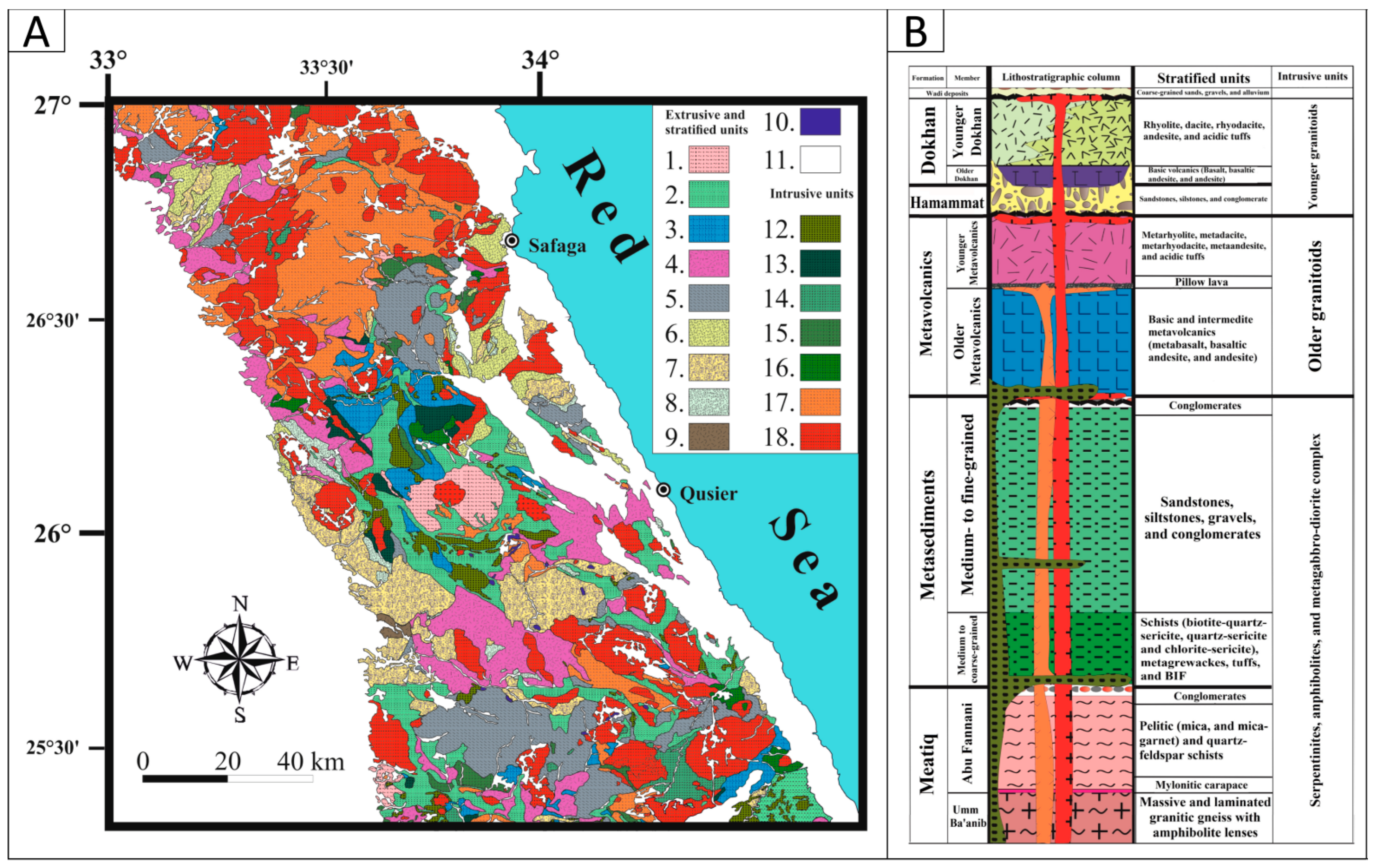 - Stern, R.J.; Kröner, A.; Rashwan, A.A. A late Precambrian (∼710 Ma) high volcanicity rift in the southern Eastern Desert of Egypt. Int. J. Earth Sci. 1991, 80, 155–170. [Google Scholar] [CrossRef]