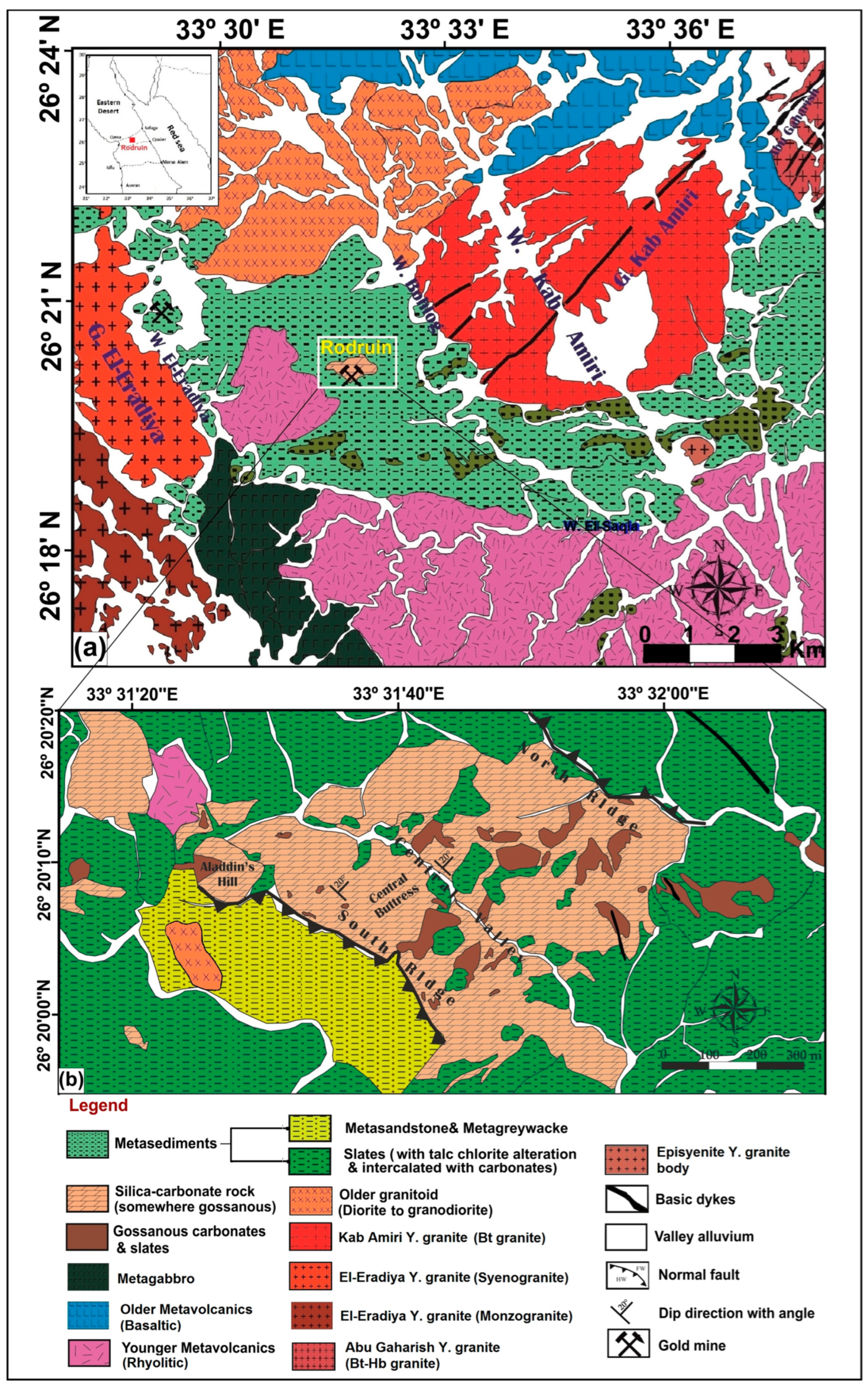 - Abd El-Wahed, M.A.A. Shear-related gold mineralization in the Egyptian Nubian Shield, East African orogenic belt. Mediterr. Geosci. Rev. 2025, 7, 185–253. [Google Scholar] [CrossRef]