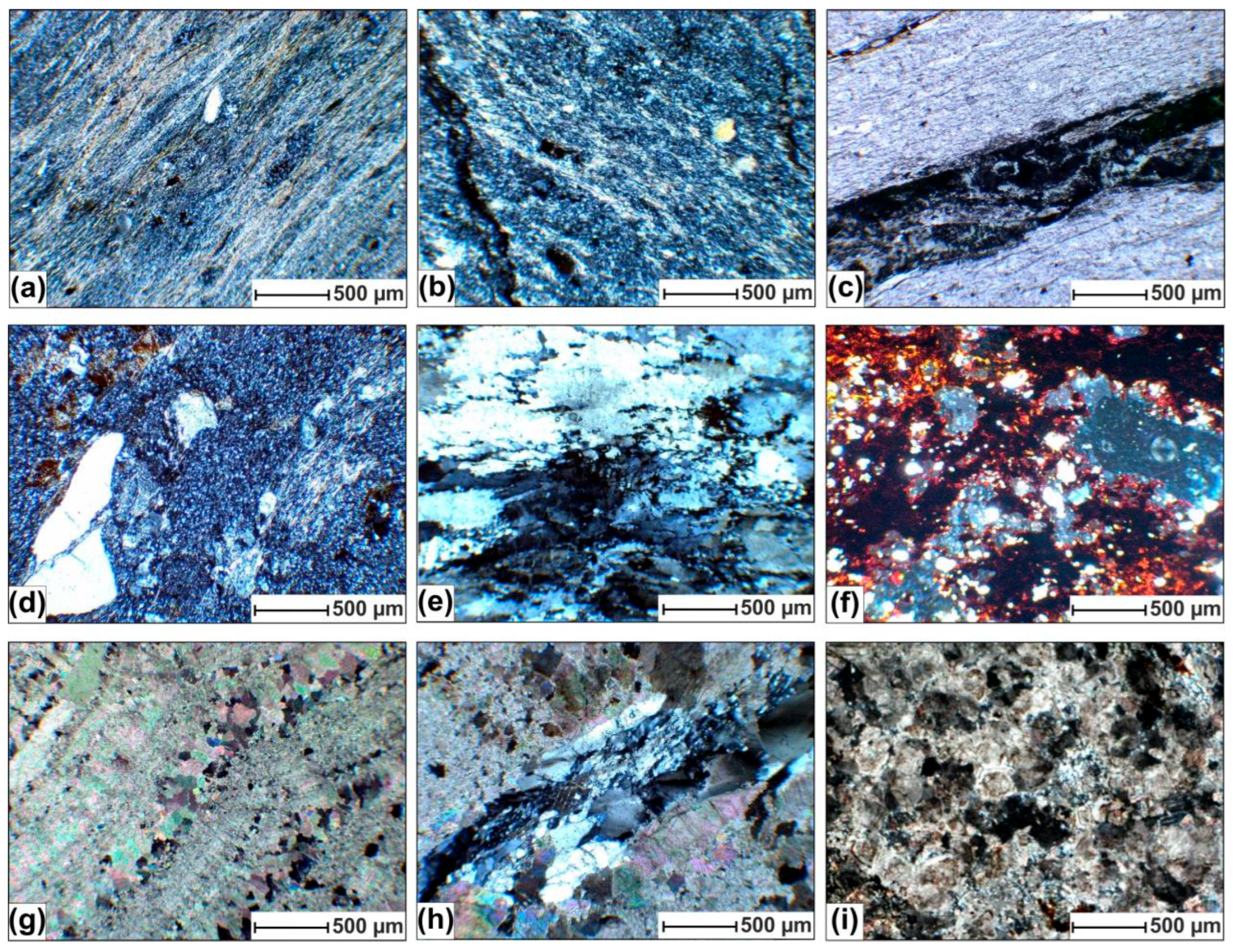 - Silica–carbonate rocks (Sample 48-RO), dominated by calcite and quartz (Figure 5h).