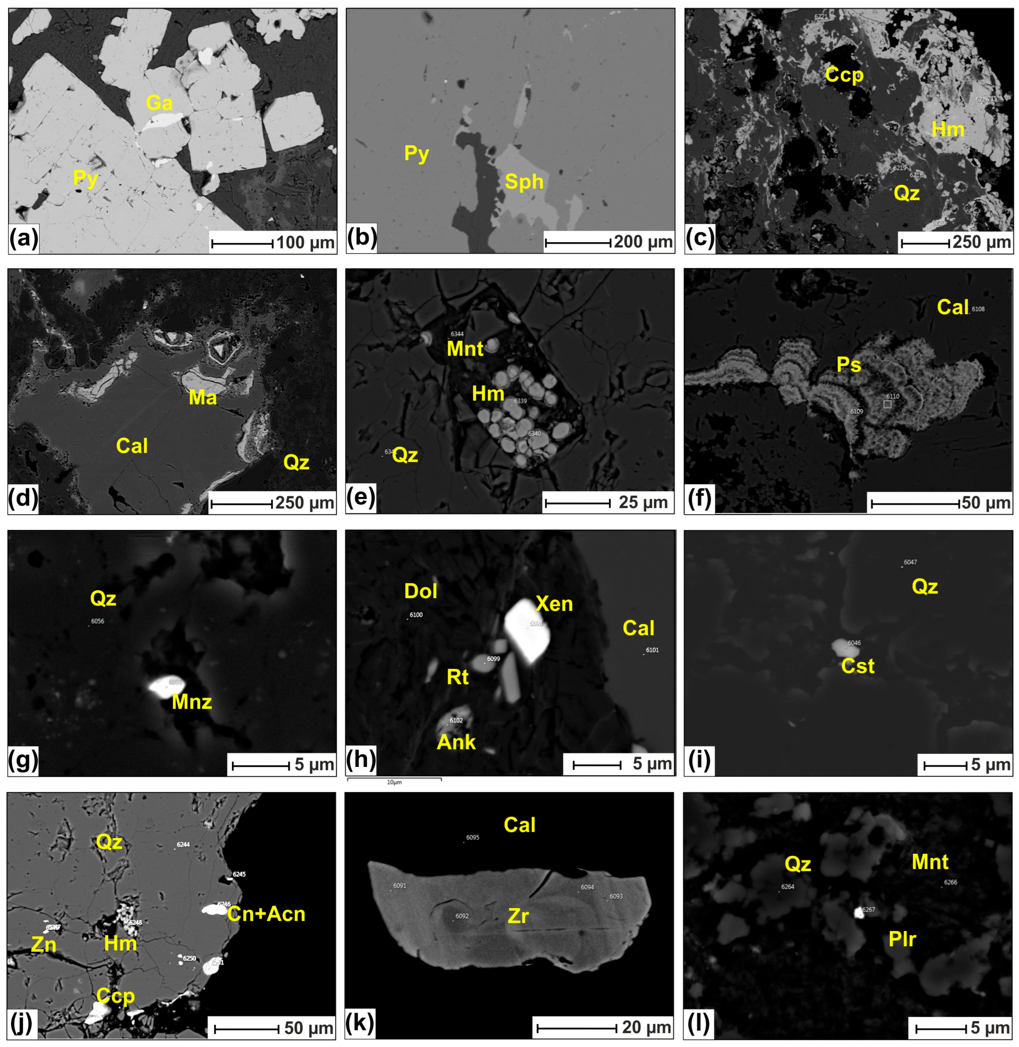 - The fresh ore is composed of pyrite, sphalerite, galena, chalcopyrite, rare cassiterite, cinnabar, native silver, hessite, tetrahedrite, and gold, respectively, in decreasing order. Non-metallic gangue minerals include quartz, calcite, dolomite, chlorite, barite, and rhodochrosite. Pyrite is found in two generations: (a) early formed coarse euhedral to subhedral grain, and (b) late-stage fine grains related to carbonate formation. The paragenetic sequence indicates that the earliest mineralization stage was characterized by the crystallization of first-generation pyrite and chalcopyrite, followed by a later stage marked by the deposition of sphalerite and galena.