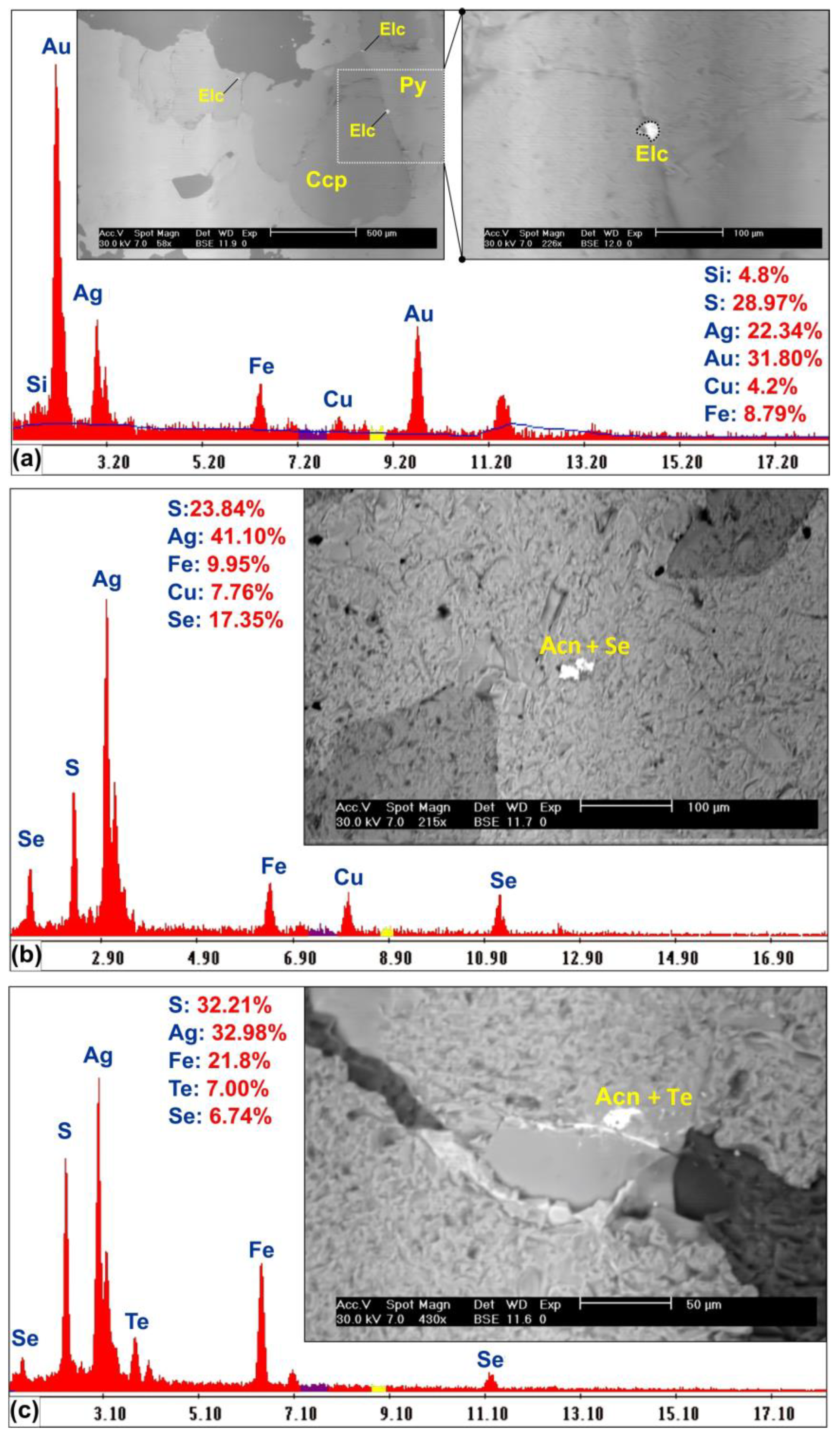 | Ore Mineralogy | Pyrite, arsenopyrite, ±sphalerite, ±chalcopyrite, ±galena, ±pyrrhotite, and gold [83,87,89,90,91]. | Pyrite, sphalerite, galena, argentite, electrum ±enargite ±digenite, chalcopyrite, pyrrhotite, tetrahedrite, barite, hessite, petzite, pyrargyrite ±bornite ±arsenopyrite [72,92]. | Pyrite, sphalerite, chalcopyrite, galena, gold, Cassiterite, Cinnabar, silver-telluride |