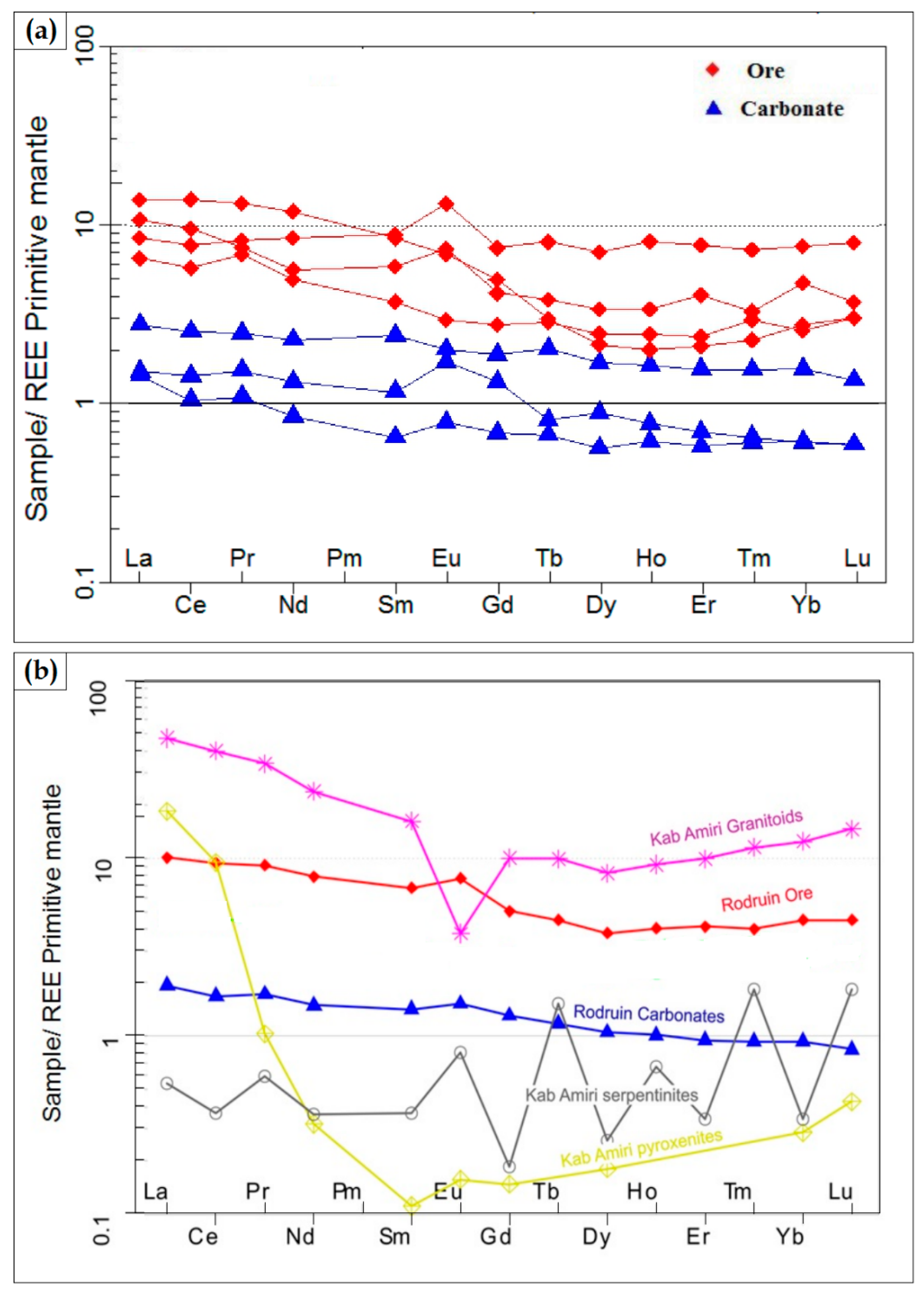 - The ore is hosted in Neoroterozoic metasedimentary rocks formed in a subduction-related tectonic environment. The ore body is characterized by large tonnage, high gold grades, and steeply dipping veins, reflecting a tectonic regime that evolved from compression to transpression, later accompanied by extensional deformation. These structural and tectonic features, along with ore mineralogy, metal associations, and the absence of significant metal zonation, closely resemble turbidite-hosted gold deposits. However, the widespread occurrence of felsic-magmatic mineral inclusions in both carbonates and mineralized metasediments, together with the presence of granitophilic elements in the ores, indicates a strong link between the mineralization and granitoid activity. Furthermore, the rare earth element (REE) patterns of the ore closely correlate with those of the Kab Amiri granitoids rather than ultramafic intrusions, suggesting the contribution of magmatic fluids to ore formation. Collectively, these observations support a hybrid magmatic–metamorphic origin for the ore-forming fluids at Rodruin.