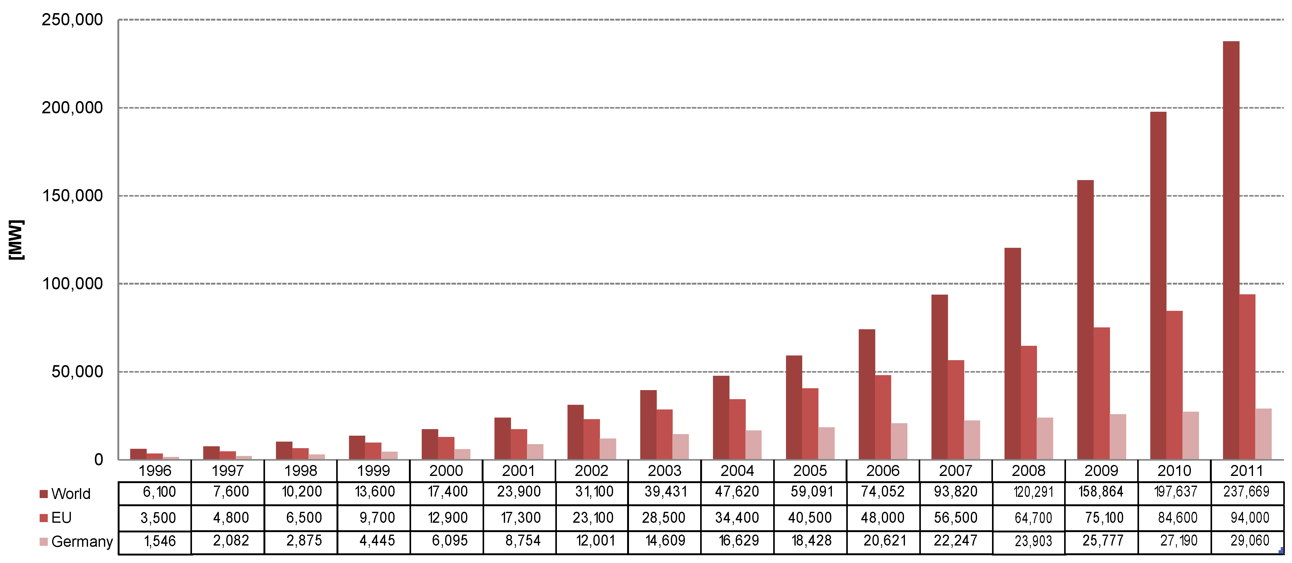 The installed capacity of wind energy is growing rapidly. Over the past 15 years, wind energy has undergone a rapid expansion in Germany, the European Union (EU), and globally. Worldwide, the installed wind energy capacity increased from 6100 MW in 1996 to about 238,000 MW in 2011 [1]. In the EU, wind energy converters accounted for 21.4% (=9616 MW) of all newly installed capacity in 2011, representing the third biggest share after solar PV (46.7%) and gas (21.6%) [2]. Within the EU, Germany has been the largest market with an installation of almost 2100 MW in 2011 [2]. When looking at a 10 year period, the rapid expansion of wind energy becomes even more evident: while the share of wind energy in the EU’s capacity mix was about 2% in the year 2000 (=12,887 MW) it accounted for over 10% (=93,957 MW) in 2011 [2]. Figure 1 shows the development of installed capacity over a 15 year time period for Germany, the EU, and globally.
