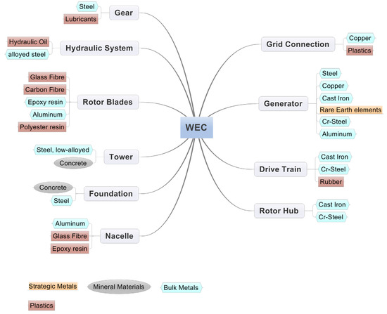 The relevant materials have been selected based on the literature on inventory data of wind turbines. This screening resulted in a list of potentially relevant materials that are shown in Figure 2. A cut-off criterion has been applied and all materials with less than one weight per cent have been excluded. In a second step, the criticality of the excluded materials has been regarded [19,20], and particularly critical metals—the rare earth metals neodymium and dysprosium—have been added to the list of relevant materials.