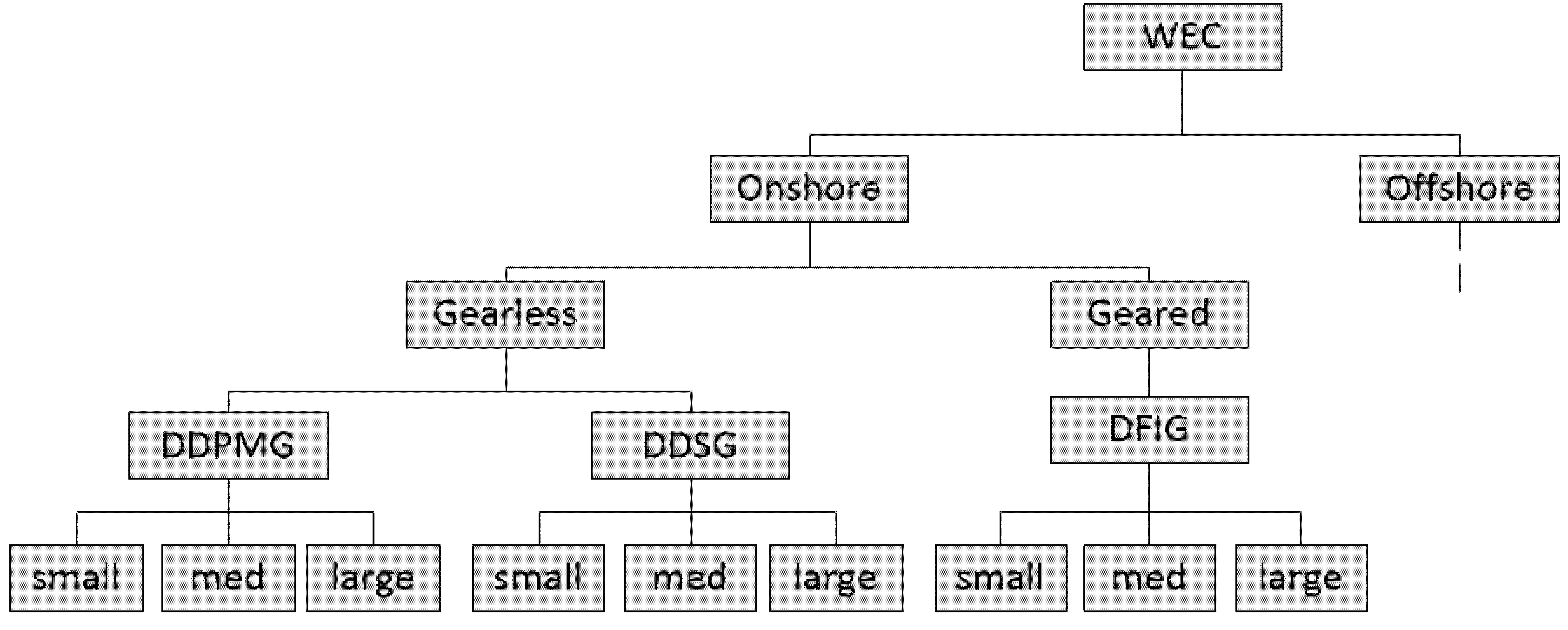 The figure shows only the differentiation for onshore converters; the classification for offshore converters has been done accordingly, except that the size denominations (small, medium, large) represent higher power ratings than in the onshore case. Regarding their specific material demand the main difference between offshore and onshore WECs is their respective foundation technology. Onshore WECs mostly use concrete foundations while offshore converters are installed on steel structures. Another distinction has to be made between gearless and geared converters as there is a general difference in components and generator technology. In geared converters the low rotational speed of the rotor is converted into a higher rotating speed to drive the generator. Commonly, doubly fed induction generators (DFIG) are used. In gearless wind turbine concepts, however, the low rotor speed is used directly to power a specially designed low-speed generator not requiring a gear-box. Gearless generator concepts need to be further distinguished into permanent-magnet-generators (DDPMG) and doubly fed synchronous generators (DDSG) which differ in the electric field generation.