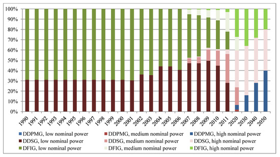 For the assessment of secondary material potentials, historic and future installations of wind energy converters have to be considered. Relevant installations of wind energy in Germany started in the 1990s. The underlying data has been taken from DEWI statistics [21,33]. These statistics include data on market shares of wind turbine manufacturers. Since companies stuck to a particular technology for at least several years, technology shares can be approximately deduced from market shares. The majority of producers used the DFIG concept up to 2010, while the leading manufacturer (Enercon) started to manufacture DDSG converters in 1993 and currently has a market share of about 60%. Up to 2010, DDPMG can be considered as negligible for the German market.