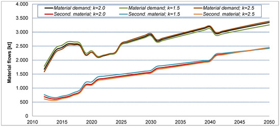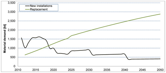 Although using the Weibull distribution instead of a simultaneous exit function can be considered the more appropriate approach, it is still subject to uncertainties resulting from choosing the Weibull parameters. As stated in Section 2.6, to the authors’ knowledge no studies providing actual age statistics for wind turbines have been published so far. With shape parameters for most products varying between 1 and 3 and those of long living infrastructure and industrial commodities being around 2, a shape parameter of 2 has been selected in this study. Addressing how this uncertainty affects the results, additional k-values have been tested and their influence on the modeled material flows has been identified. In addition to k = 2, values of 1.5 and 2.5 have been used and the results are shown in Figure 16. It is evident that the influence of this parameter variation is marginal. The other Weibull parameter is fixed by the assumption on the average lifespan of wind energy converters, which is of course unknown, too, but to a lesser degree. There is currently no evidence that the lifespan deviates significantly from the assumed 20 years. Still, a statistical assessment of the validity of this assumption will have to wait until there is larger number of end-of-life converters. For the time being, we will have to trust in the accuracy of this manufacturers’ estimate. However, even if the average lifespan of the converters would be off by a few %, for example, 10%, the above given material demand curves would only be partly shifted a few years into the future or the past, i.e., the replacement demand would be appearing earlier or later. Their principal shape, however, and the approximate size of the peaks would be retained. Based on this fact and the above discussion, we are confident that potential uncertainties regarding the Weibull parameters are not likely to have a significant influence on the calculated results. In contrast, assuming a simultaneous exit function to model the future material flows resulting from wind energy deployment leads to significantly differing results. In Figure 17, the results for the reference scenario using the Weibull distribution with an average life span of T = 20 and a shape parameter of k = 2 are compared to the results from using the simultaneous exit function with a life span (time span for simultaneous exit) of T = 20. The flows obtained from assuming the simultaneous exit show very characteristic peaks in the year 2022 and 2042 (for the material demand as well as for the secondary material flows). In 2022, not only the newly installed converters, but also all converters installed in 2002, the year with the historically highest newly installed capacity, need replacement due to their simultaneous exit. The same occurs every 20 years. In comparison, such peaks do not occur in the Weibull graphs (cf. Figure 18). Even though both approaches do not differ significantly in the total material flows (i.e., less than 5% difference in the material demand over the considered time span), the simultaneous exit function shows severe shortcomings if it was to be used for planning purposes. Such shortcomings would, e.g., include the overestimation of expected peak material demands or the need of secondary materials processing infrastructure.