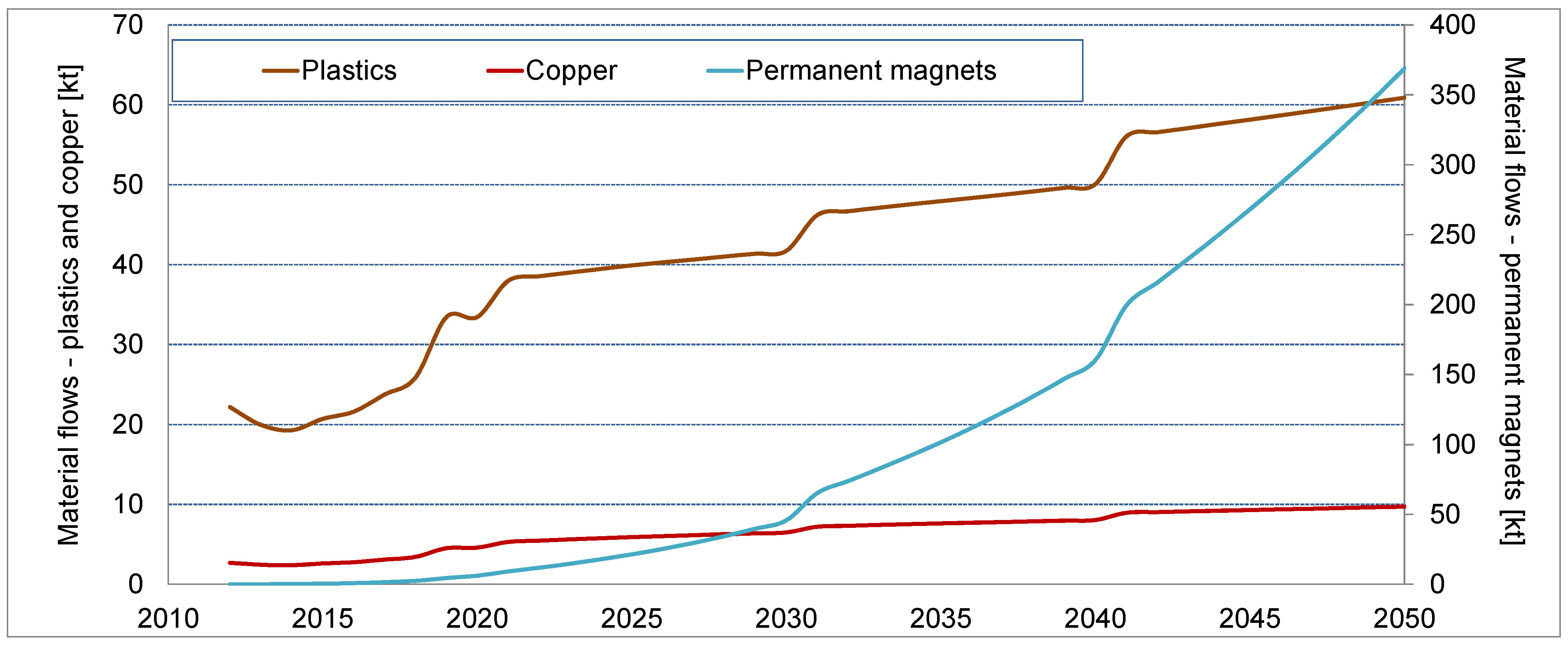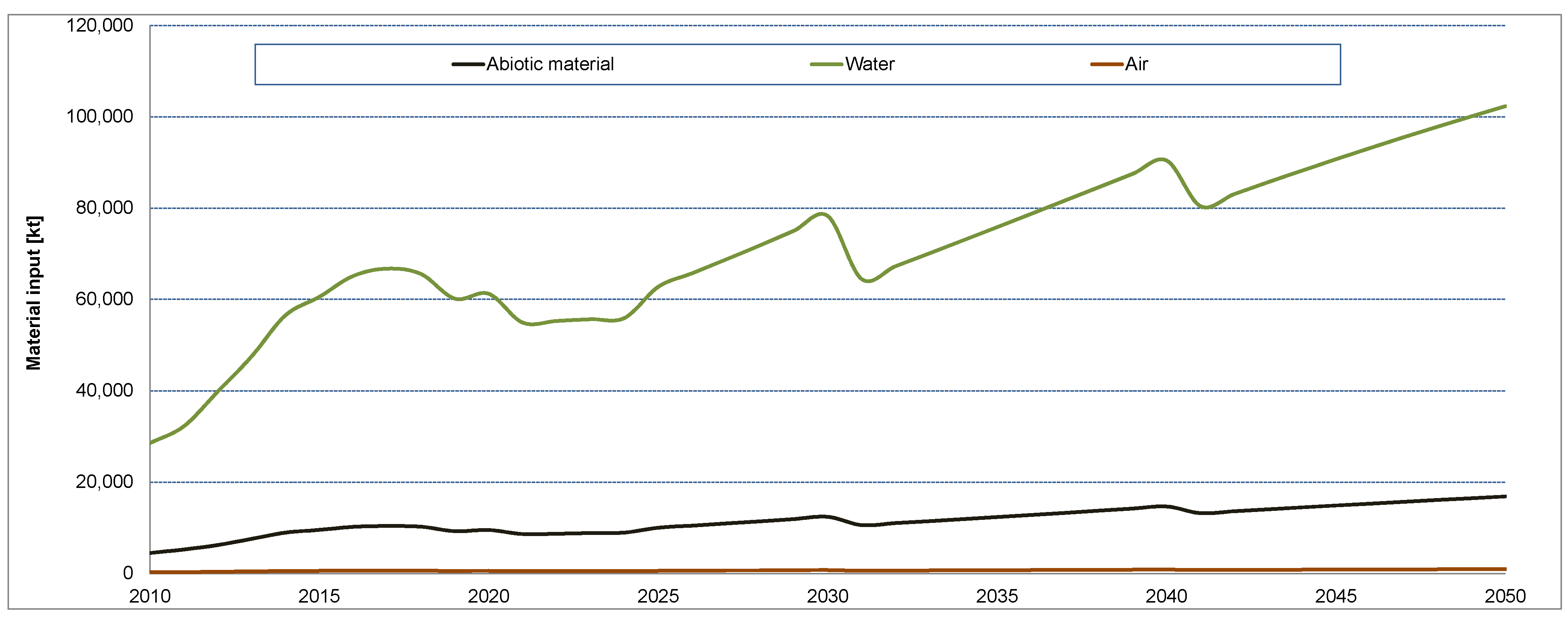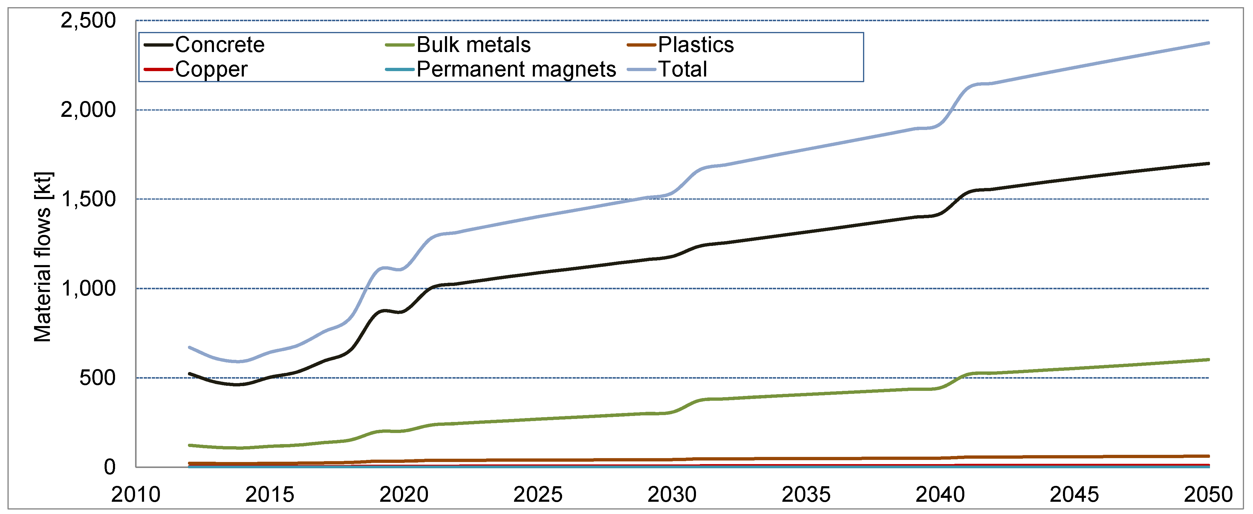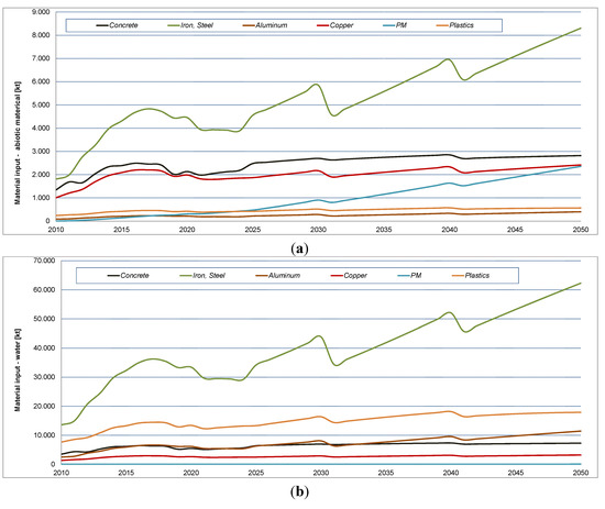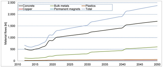 A differentiated picture of the total material requirements emerges when the direct material inputs are looked at separately. While the direct material demand was dominated by concrete, followed with some distance by the bulk metals, the application of the MIPS concept shows quite different results. Here, iron and steel are the dominant materials in terms of abiotic material and water input, growing to over 8000 kt and 62,000 kt, respectively, until 2050. The abiotic material input for concrete grows to nearly 3000 kt, followed closely by copper. The abiotic material input for permanent magnets shows a most significant growth. While in 2010 the material input arising from permanent magnet material is almost negligible, it almost catches up with copper in 2050. Plastics show significance in terms of water use, followed by aluminum.