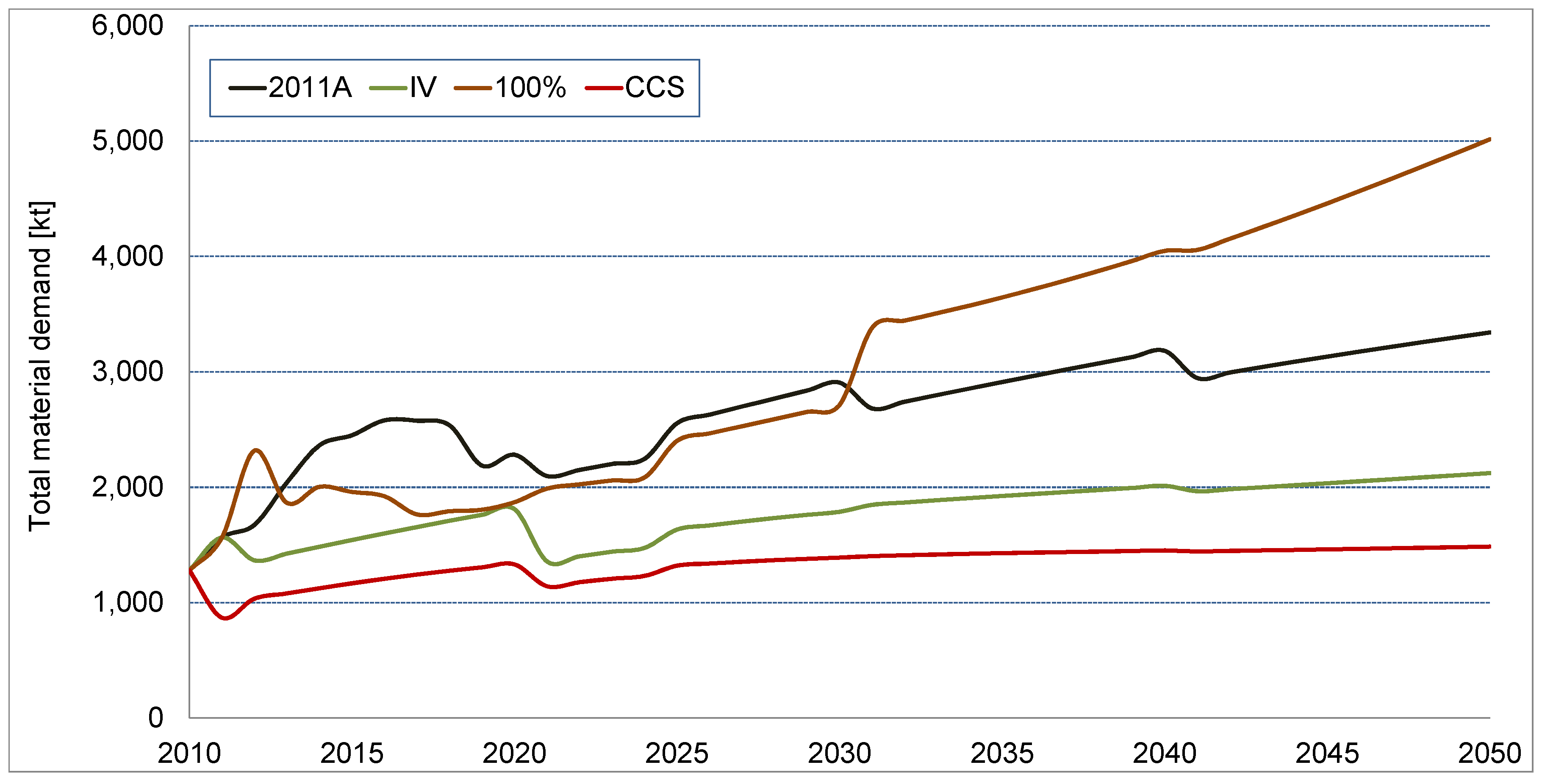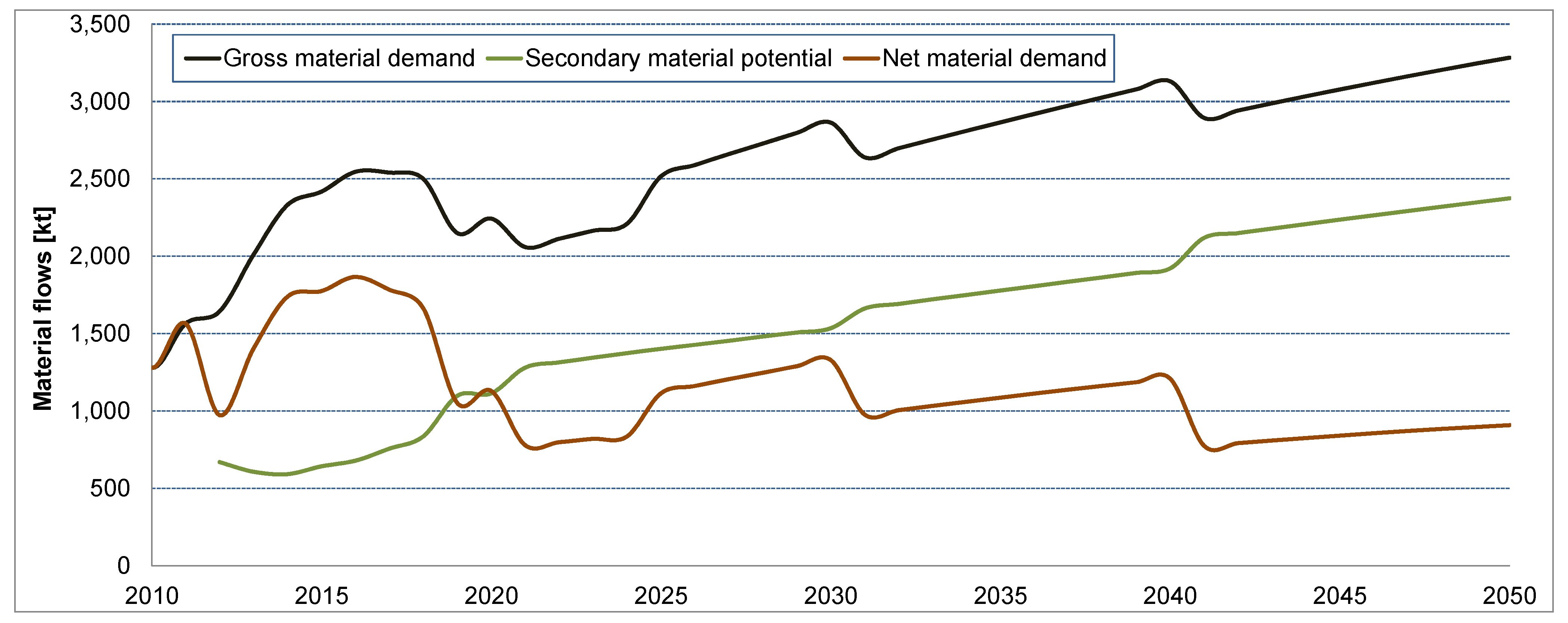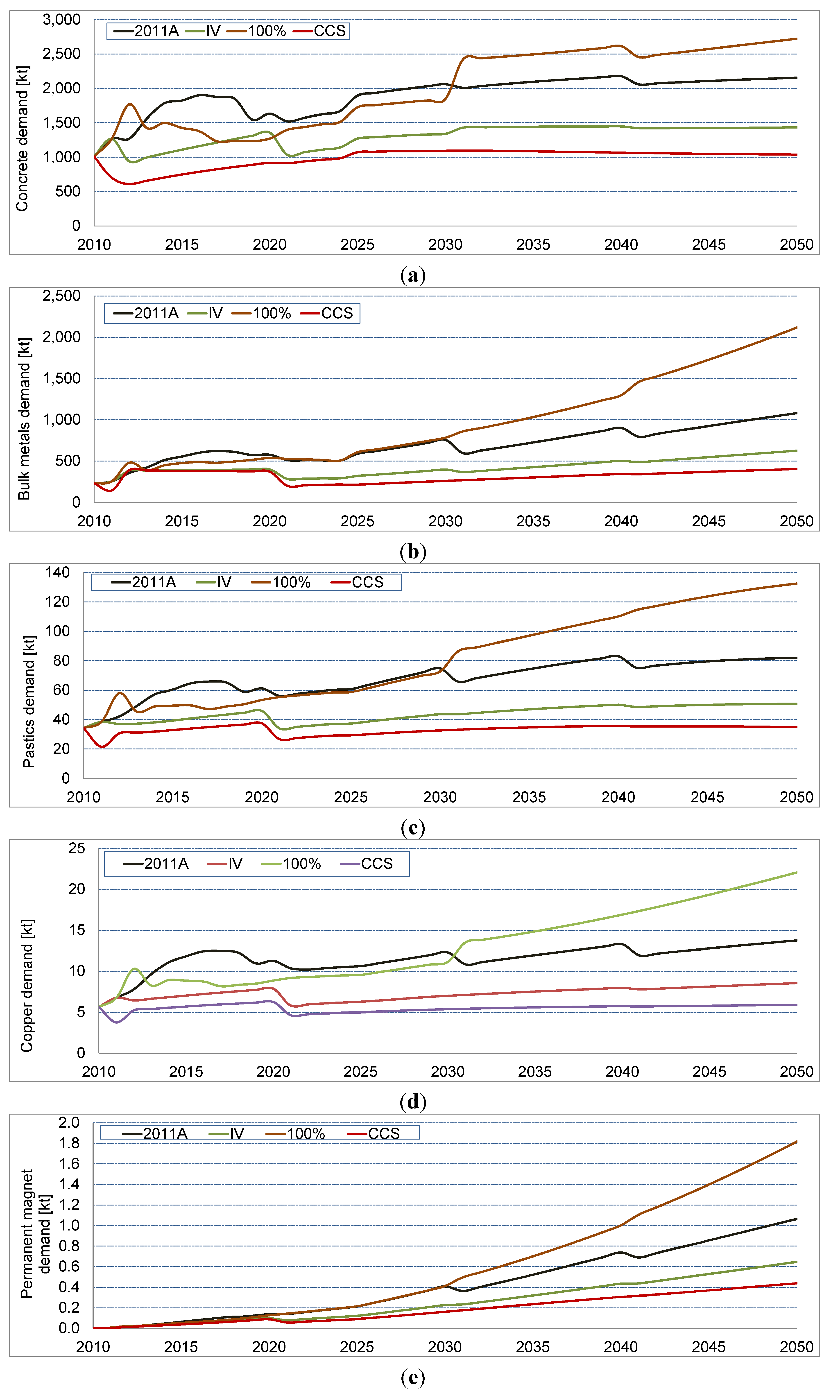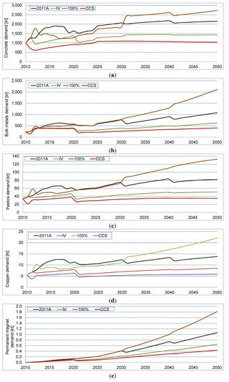 A differentiated picture of the total material requirements emerges when the direct material inputs are looked at separately. While the direct material demand was dominated by concrete, followed with some distance by the bulk metals, the application of the MIPS concept shows quite different results. Here, iron and steel are the dominant materials in terms of abiotic material and water input, growing to over 8000 kt and 62,000 kt, respectively, until 2050. The abiotic material input for concrete grows to nearly 3000 kt, followed closely by copper. The abiotic material input for permanent magnets shows a most significant growth. While in 2010 the material input arising from permanent magnet material is almost negligible, it almost catches up with copper in 2050. Plastics show significance in terms of water use, followed by aluminum.