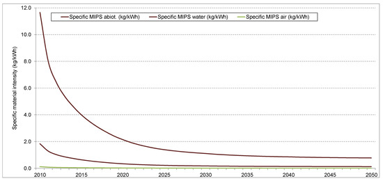 In view of the potential contribution of the ongoing energy transition towards dematerializing the German economy, it is informative to calculate the specific material intensity of electricity generated from wind energy. For the 2011A scenario we calculated the cumulated installed wind power from 2010 onwards and the cumulated material inputs. The electricity generation can be calculated by assuming future capacity factors, or full-load-hours (FLH) for wind energy installations. The average FLH for German onshore wind energy installations between 2000 and 2010 was 1483 h (based on data from the German Wind Energy Association BWE [68]). For offshore parks there are no such statistics available yet. However, first results from parks in the Baltic Sea and the North Sea show FLH values between 3000 and 4000 h (cf. [69]). For our calculations we have assumed conservative FLH values of 1450 h for onshore and 3500 for offshore installations. Together with the aggregated material inputs we could then determine the MIPS value for electricity produced from WEC installed between 2010 and 2050, see Figure 15. The potential contribution to dematerializing the German economy is discussed further below.