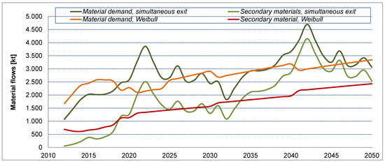 Comparison of material flows: Weibull function vs. simultaneous exit.