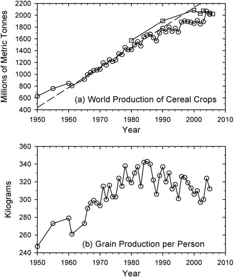 World production of cereal crops and grain production per person. Circles in (a) 1961–2005 []; and (b) 1950, 1955 and 1960 []; Squares in (a) data prior to 2005 from []; and (b) Data for 2005 and 2006 from []. The points for 2005 and 2006 are estimated by the authors of the FAO study. The dashed line in (a) is a linear regression of the data from 1961 to 1980. The lower slope prior to 1960 is probably due to the fact that the Green Revolution did not show full worldwide effect until then. Note the lowering of the slope that began in the 1990s in (a) and the downward turn that began in the 1980s in (b).