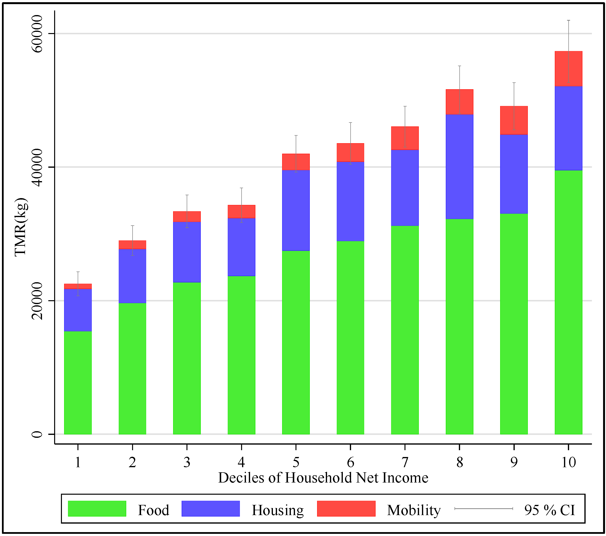 By plotting the average resource use (total material requirement TMR in kg) of food, housing and mobility against deciles of household net income with a 95% confidence interval (CI) (Figure 2), the average resource use rises in total when income rises, except for resource use of the ninth decile. Herein, the expenditures for housing decline stronger than the expenditures for food increase. Resource use for food rises continuously, as does resource use for mobility as income rises. On average, the bars show that resource use is highest for food, followed by housing and transport. When splitting the sample based on average household net income (see Table 1 for mean of household net income), higher incomes show a resource use, which is 1.5 times higher than that of lower incomes. In more detail, the lowest decile shows an average total material requirement of a total of 22.1 t, whereof 15.4 t are for food, 6.4 t for housing and 0.7 t for mobility. The highest decile shows an average total material requirement of a total of 57.2 t, whereof 39.5 t are for food, 14.5 t for housing, and 5.2 t for mobility. Thus, the highest decile shows a resource use, which is 2.6 times higher than in the lowest decile.