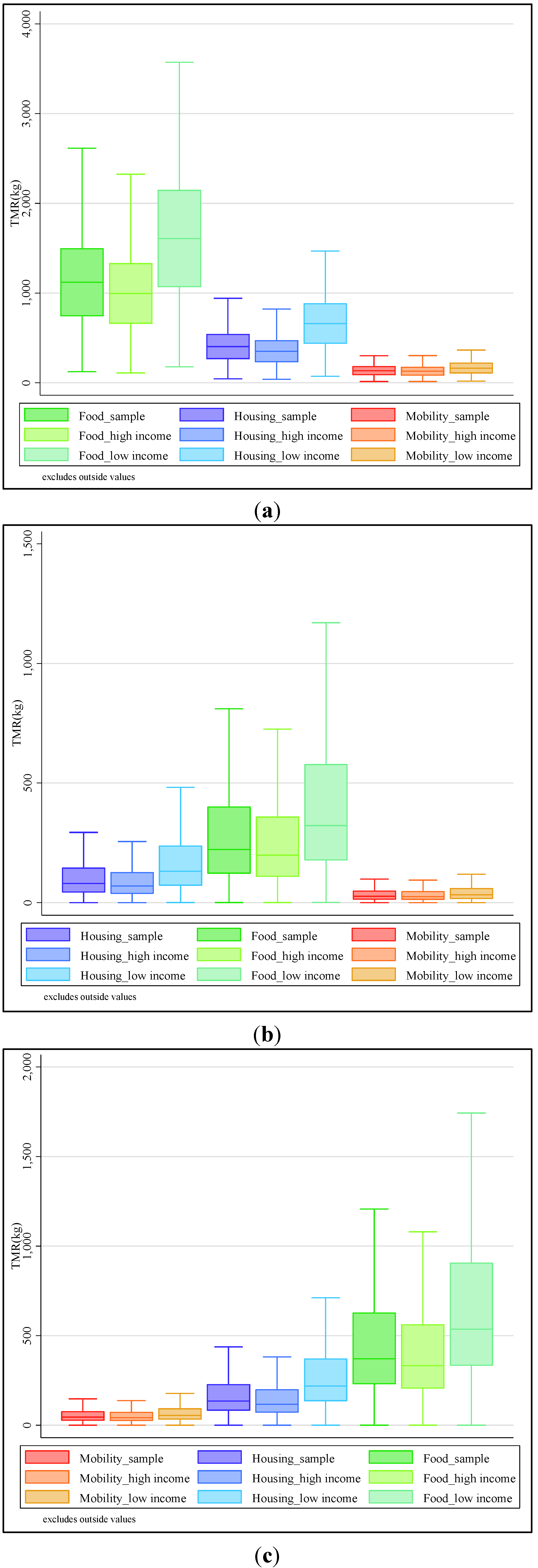 However, admitting that low incomes show higher rebound effects, one has to take into consideration that higher incomes show a total material requirement which is 1.5 times or 51% higher than the TMR of low incomes in the fields of consumption at stake. Considering the heterogeneity of rebound effects estimated in Table 5, the gap in resource use would have been closed for mobility due to the combination of a relative low level of resource use with the highest rebound effects across the fields of consumption and household net incomes. In contrast, the discrepancy in resource use across incomes would only be reduced by 14% by rebound effects in food and by 8% by rebound effects in housing. One has to remember that the higher the average level of income, the higher the average levels of resource use per household (see Figure 2).