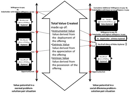 As can be seen from the Figure 5 the firm’s ability to capture value in a social dilemma problem-solution pair situation is substantially lower than in a normal problem-solution pair situation. This means that the fundamental issue is not about increasing the value creation (although that is always a desirable objective) but about how to increase the firm’s value appropriation []. This means that the fundamental issue is in fact a business model design challenge. This conclusion is also supported in the literature [,,,,,,,,,,,,,].
