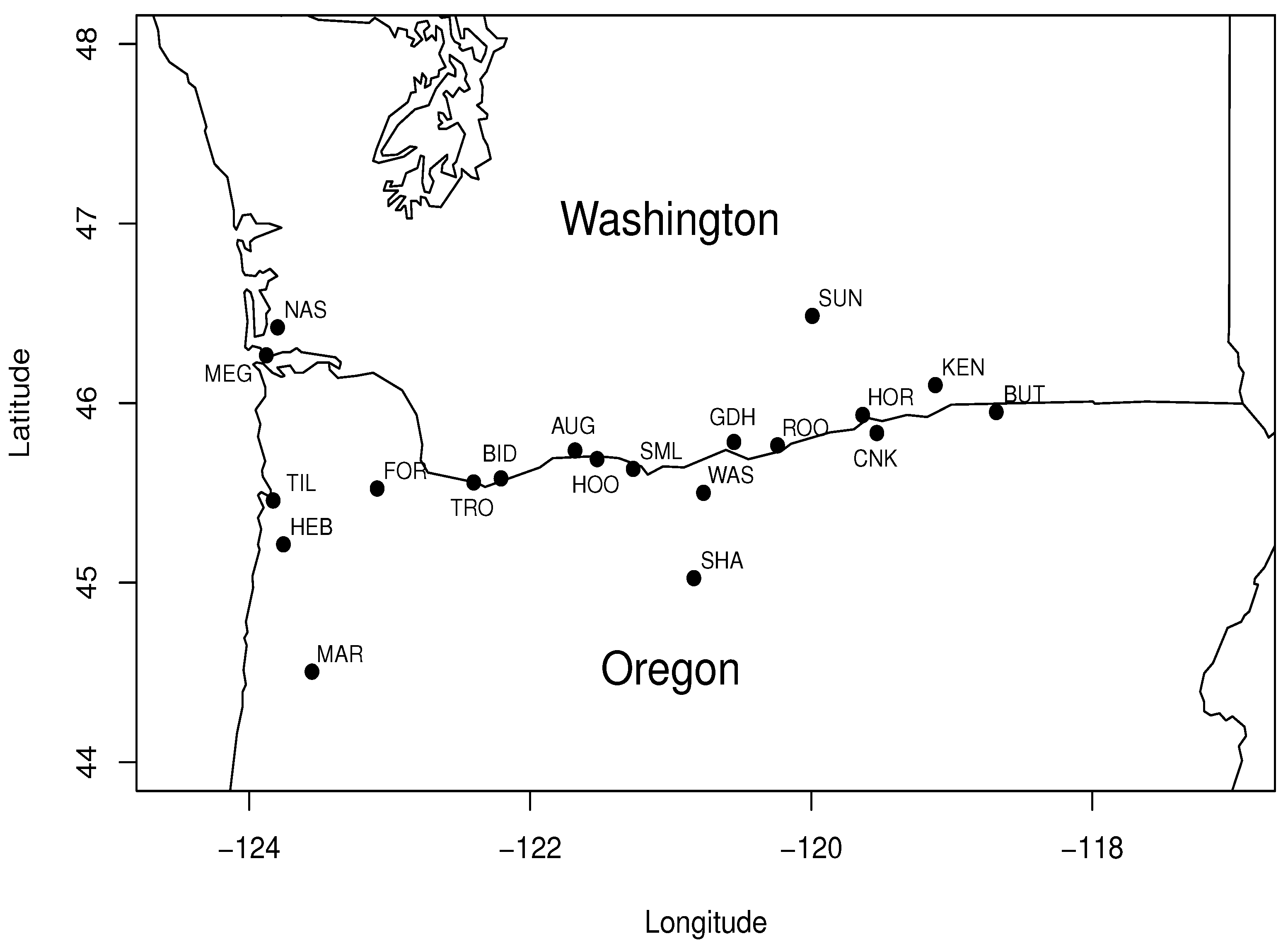 The Bonneville Power Administration (BPA) maintains and archives data from twenty meteorological towers along the border between Oregon and Washington, and it can be accessed at [50]. The tower sites are plotted in Figure 1 with their acronyms. Full names are given in Table 1. The sites are quite spatially diverse, with those along the coastline exhibiting very distinct behavior from those farther inland. In addition, most of the sites are located along the Columbia River Gorge that channels wind within its canyon, and the domain is also split by the Cascade mountains that run from the north to the south through central Washington and Oregon. Hood River lies to the west, and Sevenmile Hill is to the east of the crest of the mountains. In the western region, the climate is wet and maritime, and to the east, it is dry. Substantial east-west pressure gradients develop across the mountains, and this geography has been exploited in several wind forecasting models [17,18,51,52].