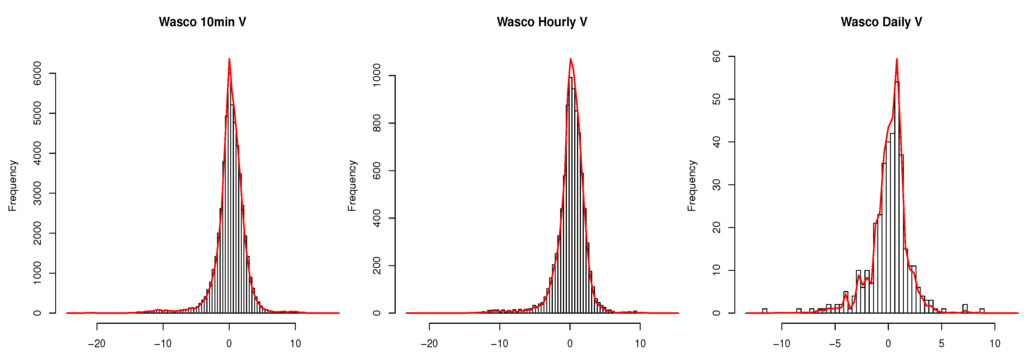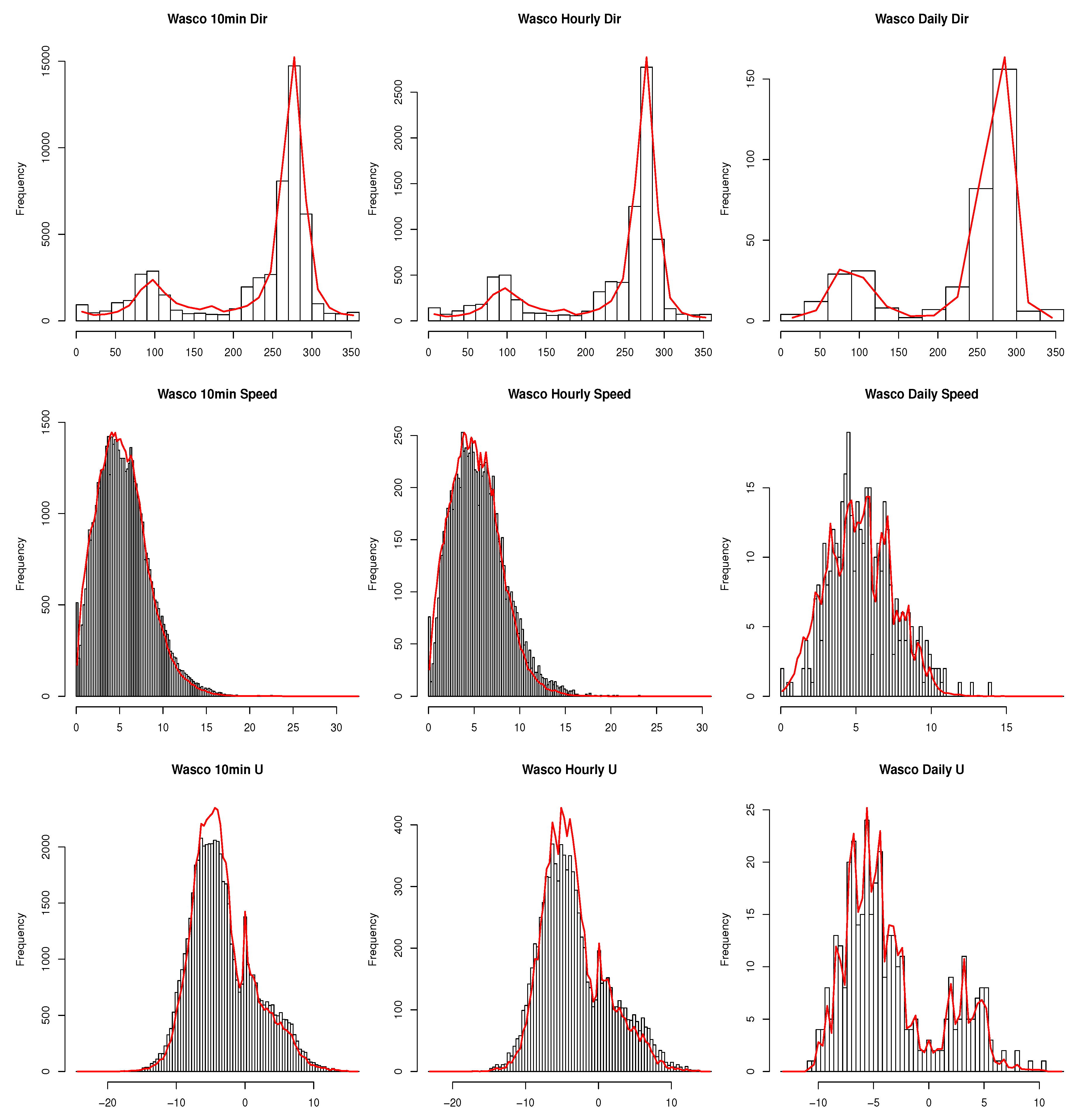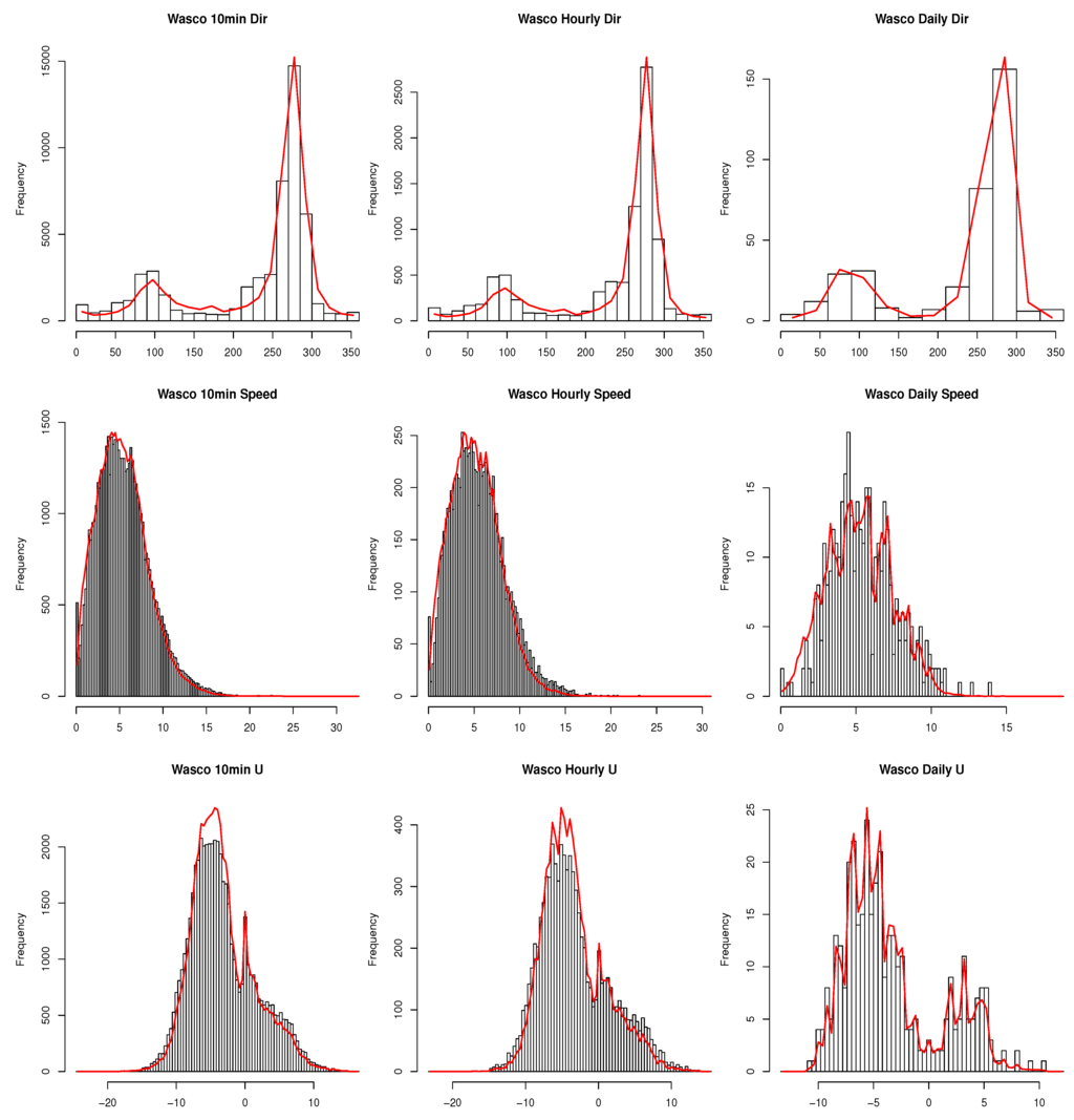 First, we take one individual location, Wasco, and Figure 2 to Figure 4 demonstrate the types of plots that we produce to evaluate the quality of the simulation. In Figure 2, the histograms of the observed direction, speed, u and v are produced. For each bin, the average count of observations across the 100 simulations is taken, and this average count is overlaid with the red curve. With the exception of the high count of observed zero wind speeds, the distributions of all of the variables in the simulation are extremely close on average to the observed. The asymmetry in the wind speeds is captured for the 10-min and hourly averages, but the asymmetry in the observed distribution diminishes for the daily averages, and this feature is also well-modeled in the simulation. Even the bi-modality in the distribution of the u component is captured.