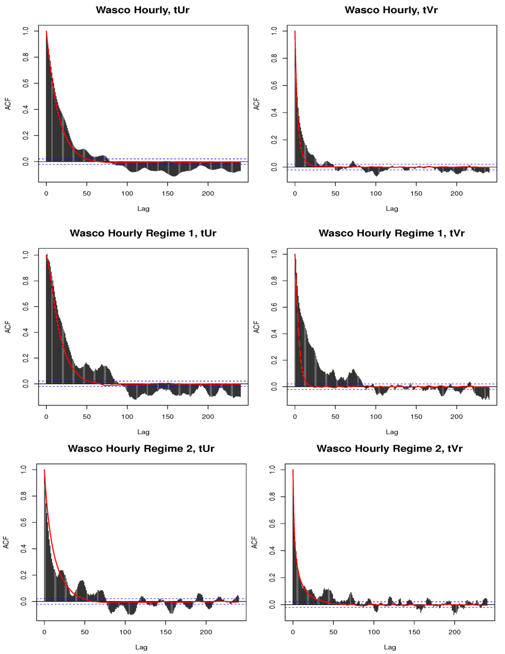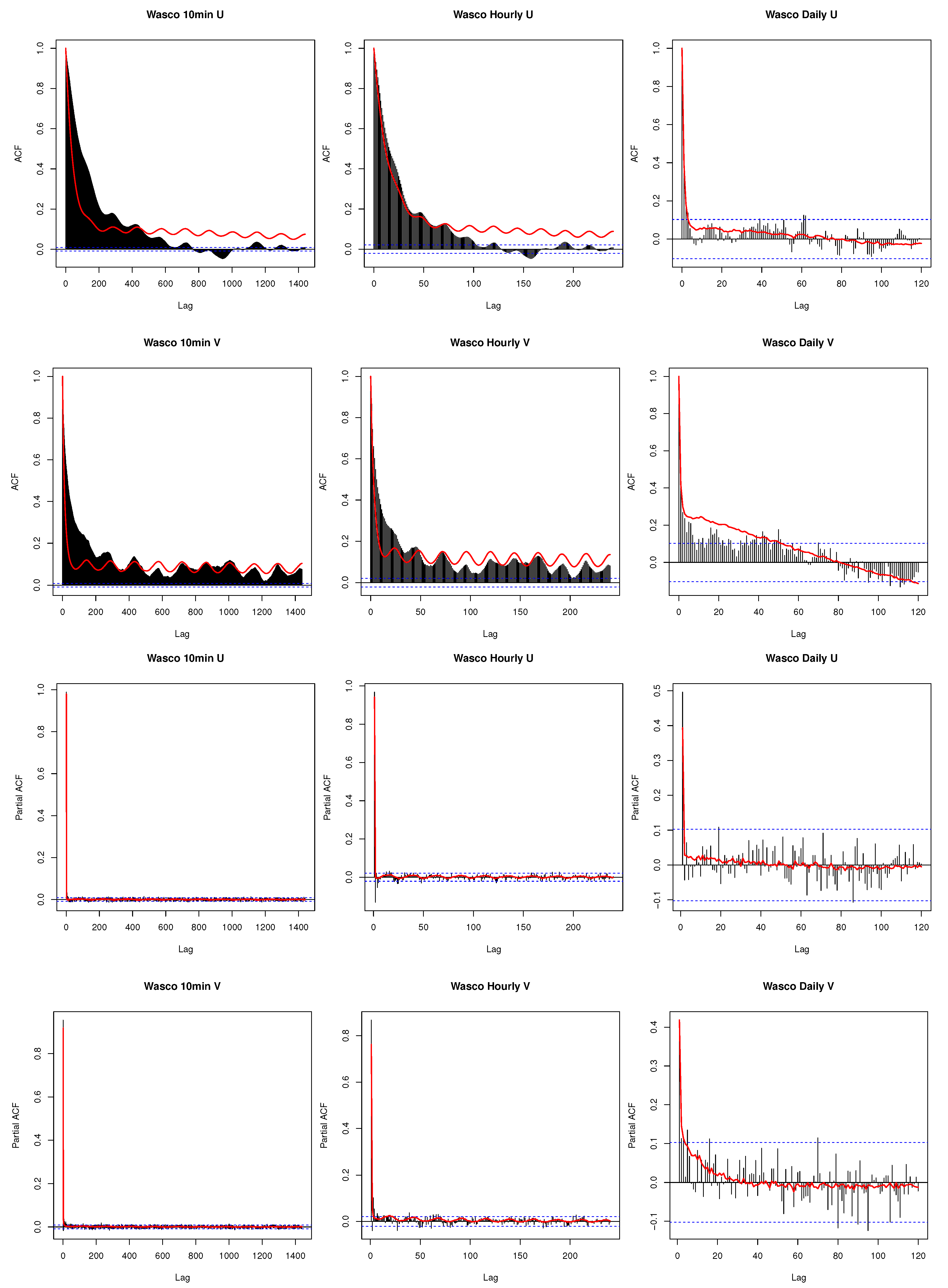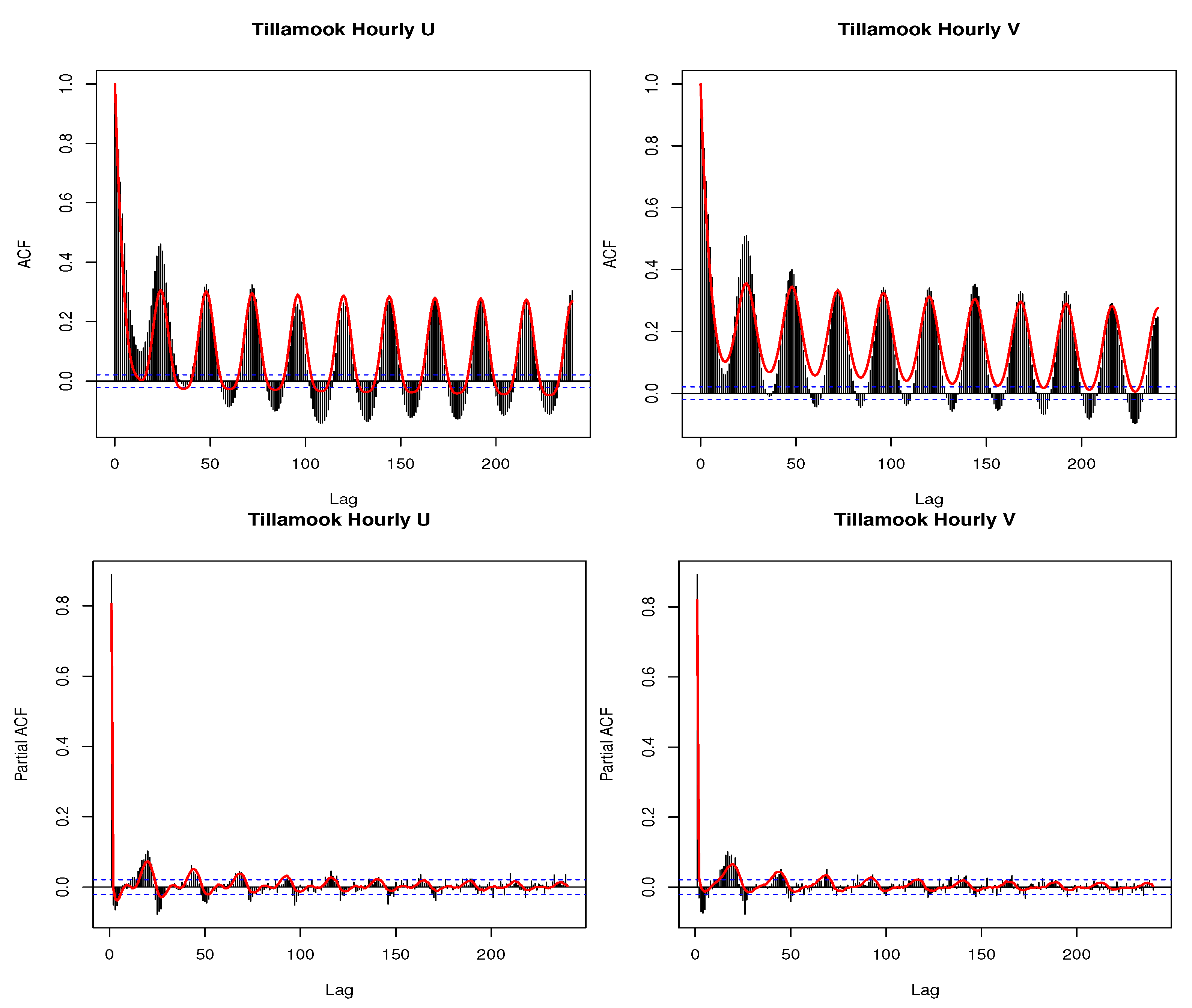- autocorrelation (ACF) and partial autocorrelation (PACF) plots of the observed u and v components with the average ACF and PACF for each lag taken over the 100 simulations overlaid (e.g., the average of 100 lag-1 autocorrelations is taken to obtain the plotted value), and diurnal variability can also be assessed with the ACF plots;