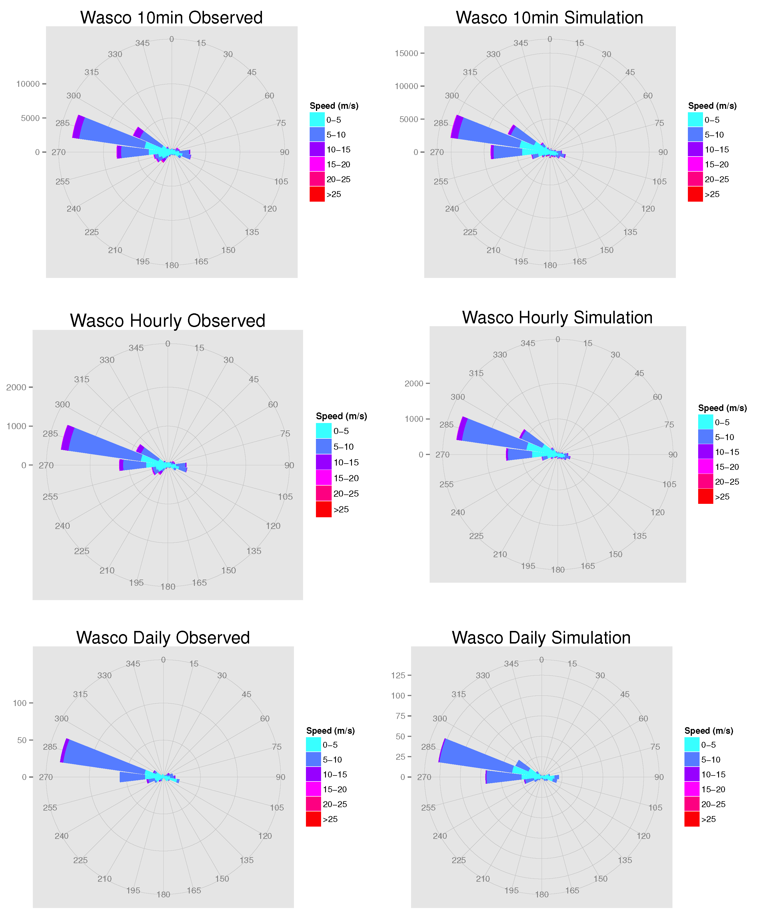 For the averages of two to three local sites, many of the same conclusions are reached as with the individual sites, even though the distributions of speed and direction are different for these cases. For the sites west of the Cascades, some very non-normal and strongly left-skewed behavior is present in the wind speed and u component, but this is well-modeled in the simulation. The temporal dependence in the west is quite strong at the 10-min and hourly scale, and the MSVAR does not quite achieve this strength in the temporal dependence. On the other hand, for the regional average, the MSVAR overestimates the temporal dependence on average at the 10-min and hourly scales. However, the joint distribution of wind speed and wind direction is quite close to the observed, and the correlations between the u and v components at all temporal scales are captured quite closely by the MSVAR model. This regional average is an important spatial scale at which to model across all temporal scales for a utility’s load balancing, dispatch and trading, and the MSVAR excels at modeling all three of these scenarios.