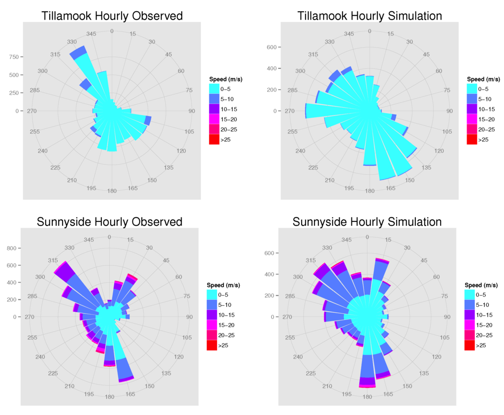 Wind roses of hourly direction and speed for the observed (left) and average across the 100 simulations (right) at Tillamook (top) and Sunnyside (bottom).