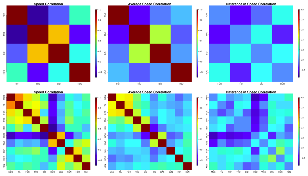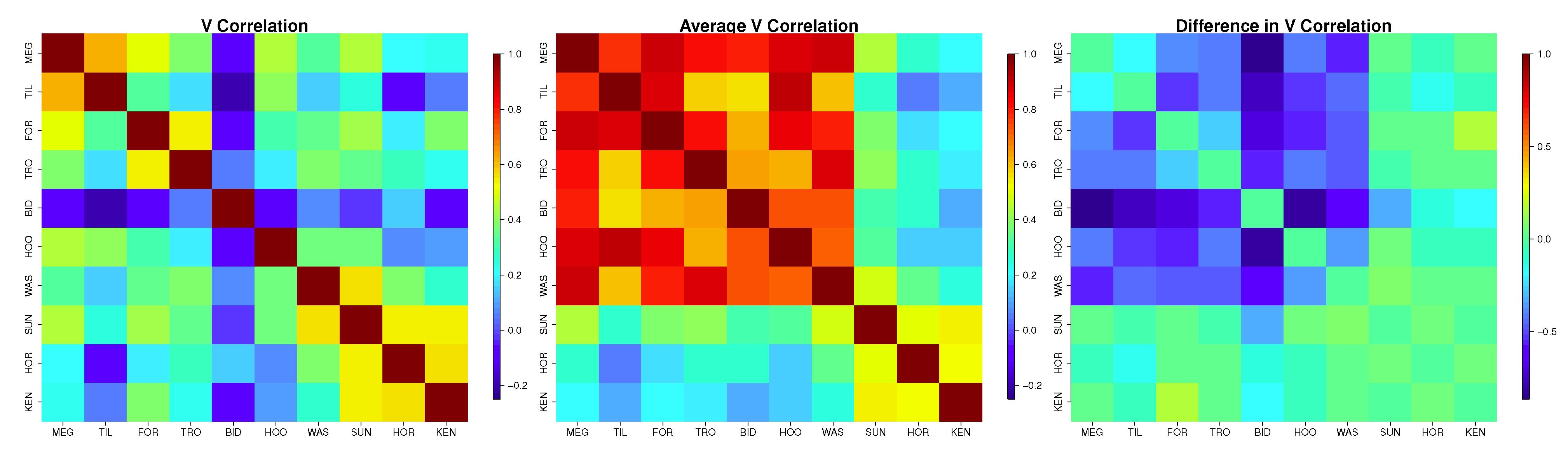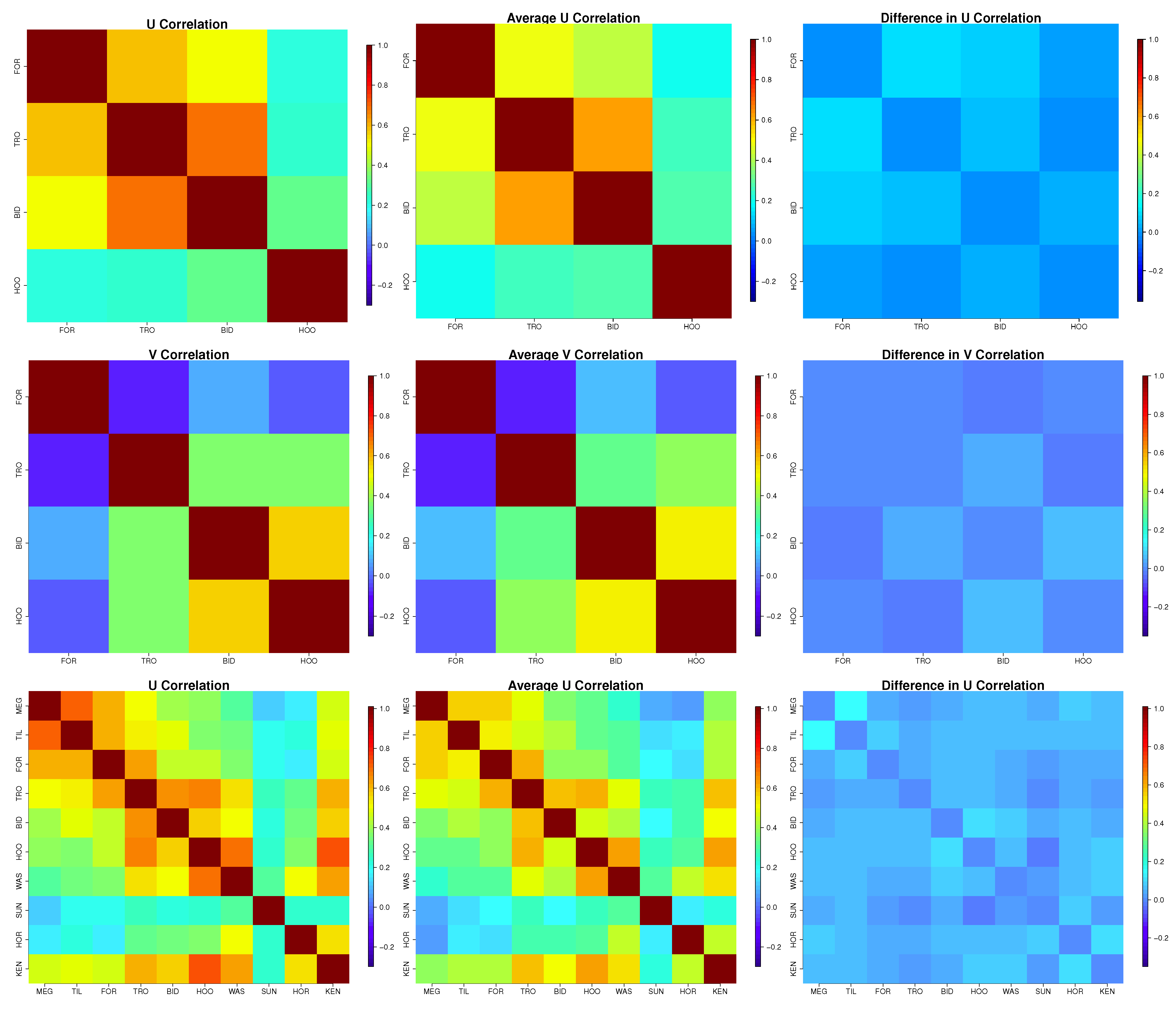- a heat map of the spatial correlations among the observed u and v components and a heat map of the average of the spatial correlations across all 100 simulations.