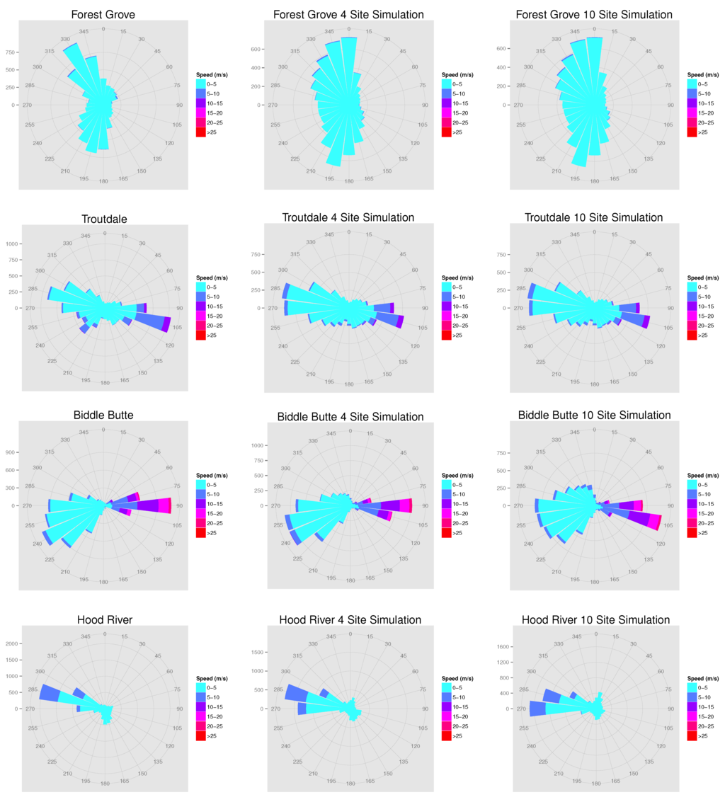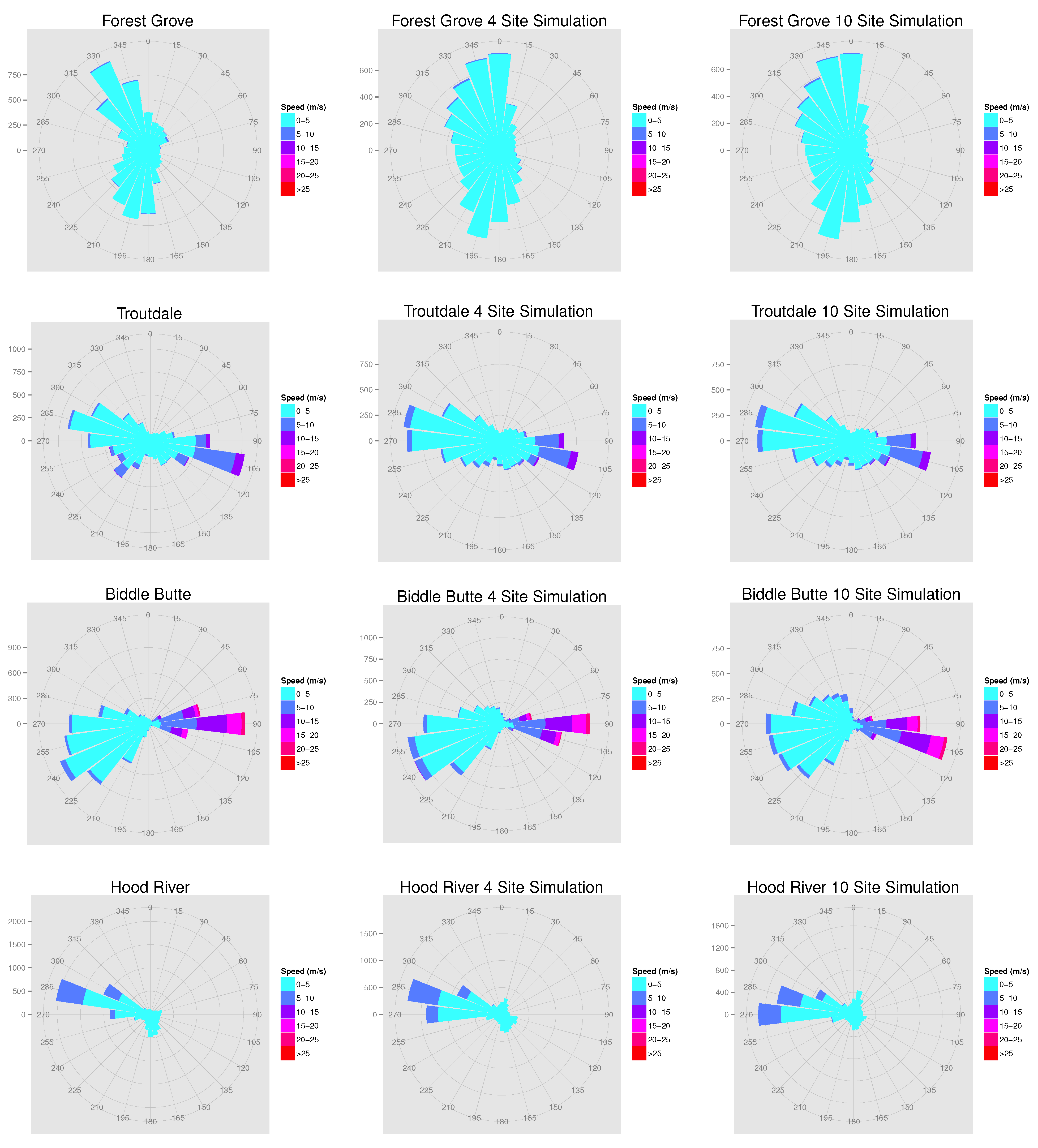 Focusing on the distribution of the speed and direction of each location individually, the features are replicated remarkably well, even though the locations have very different behavior. Figure 10 shows the wind roses of the observed and average simulated wind for the four sites that are common to both spatial simulations. The winds at Forest Grove are generally from the north or the south; Troutdale and Biddle Butte winds are almost equally split between the east and west; and Hood River winds are primarily from the west. Biddle Butte has higher wind speeds from the east than the west. All of these features are replicated in the simulated data, but they are a bit more precise in the simulation of the four sites simultaneously. As might be expected, once ten sites are simulated simultaneously, some specificity in simulating individual sites is lost. In addition, some of the sites in the set of 10 locations that have complex wind directions are more difficult to duplicate than others; for example, the wind directions of Megler, Sunnyside and Horse Heaven have greater spread in the simulated data than in the observed.