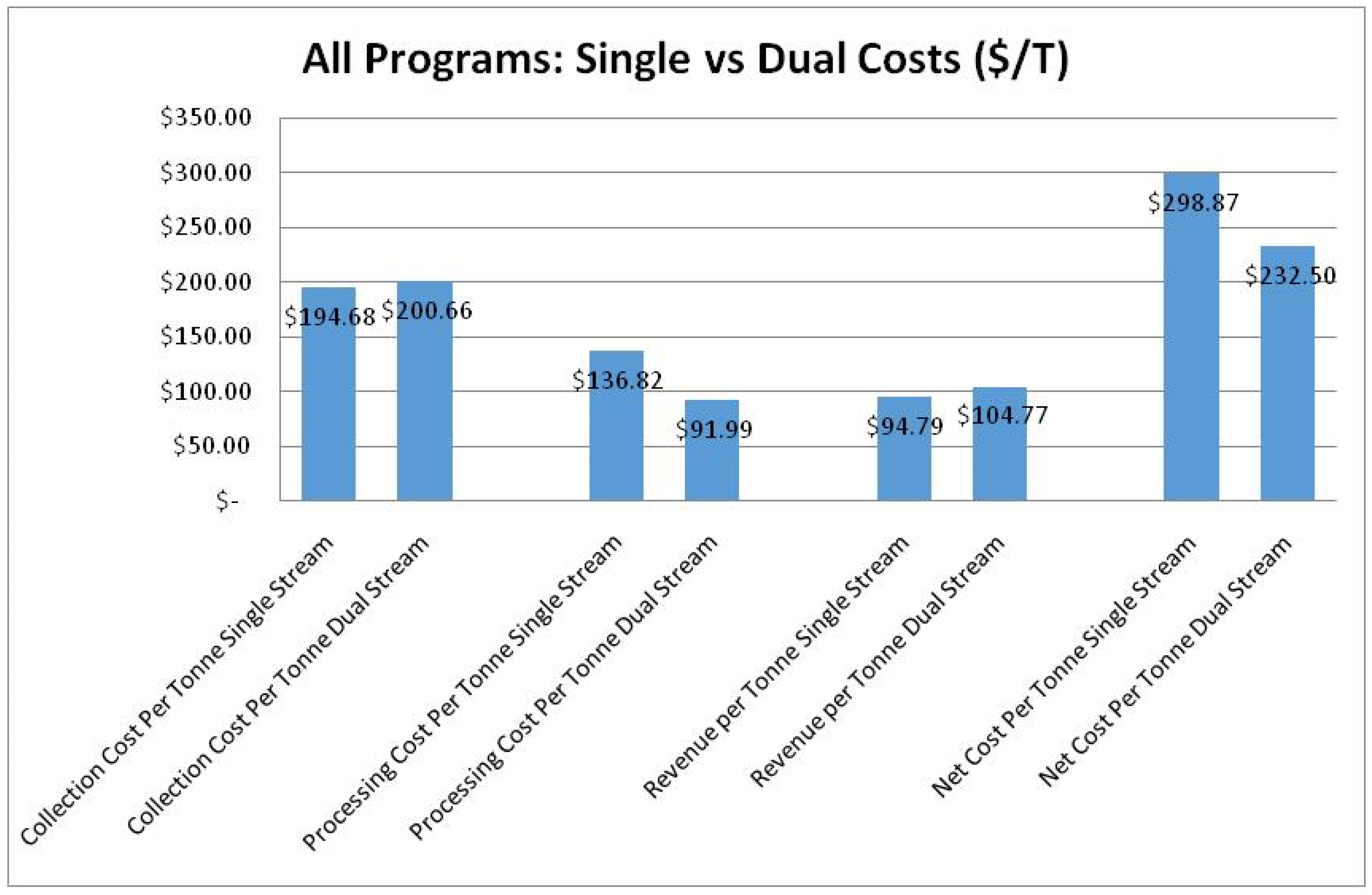 There is a general assumption held by municipal waste planners that the reduction in single stream collection costs will compensate for increased capital investments at the MRF. However, the analysis in this study found that the difference in collection costs between single and multi-stream systems was only 3%. Differences in processing costs between single and multi-stream systems was significant, which was consistent with previous findings from the literature. Additional investments in single stream MRF equipment (corrugated cardboard screens and optical sorters) inflate municipal processing costs. The general intuition behind increased mechanization at single stream MRFs is that greater volumes of material can be processed, reducing the per tonne cost of material management (costs are distributed across a greater quantity of material). While this study found that single stream MRFs are capable of processing more tonnes relative to multi-stream MRFs, the difference in processing capacity was insufficient at offsetting additional costs from investments in sorting technology. Furthermore, the quality of the recycled materials being processed in single stream materials is of inferior quality when compared to multi-stream MRFs (due to higher levels of contamination) resulting in lower realized revenues. While proponents of single stream recycling recognize that contamination and residue is higher in single stream systems, there is the assumption that savings in collection costs will more than compensate any loss in revenue (this study found that this was not the case).