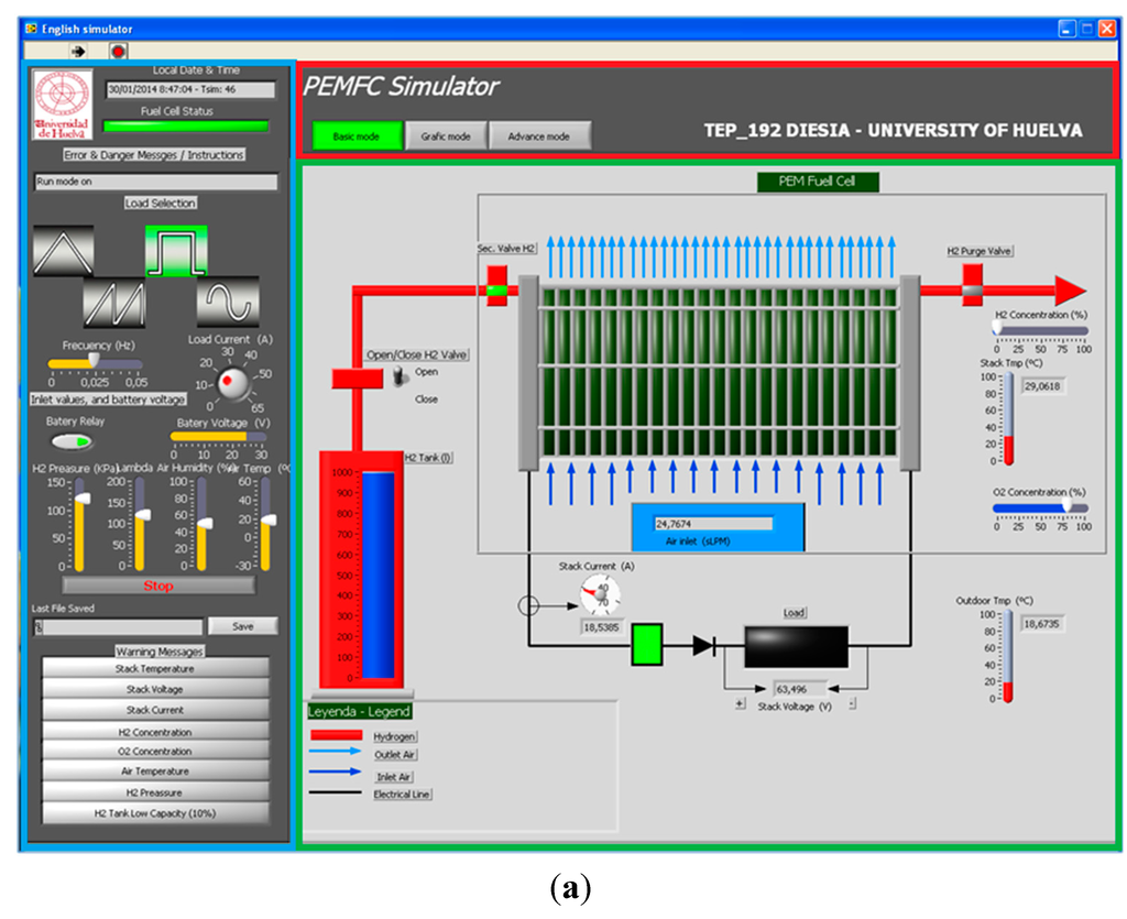 On the other hand, if the user selects the Simulator option, the software tool shows the Main window (Figure 8a). This window has been divided into three panels: one panel (squared in red in the figure), another blue panel on the left, and the panel in green in the center. The red panel is the headboard, which gives some information about the university where the software has been developed and the mode window that the user has selected. The blue panel has been called the order panel. Here the user can select the load profile based on current waveform and range; s/he can also connect the battery (see Figure 2 and Section 2.2) and define its voltage as well as establish some parameter values like inlet hydrogen pressure, oxidant stoichiometry, relative humidity, and inlet air temperature. The green area shows the fuel cell system built up from the stack, the coolant/oxidant subsystem, fuel subsystem, and electrical subsystem (as explained in Section 2) that correspond with the developed test bench.