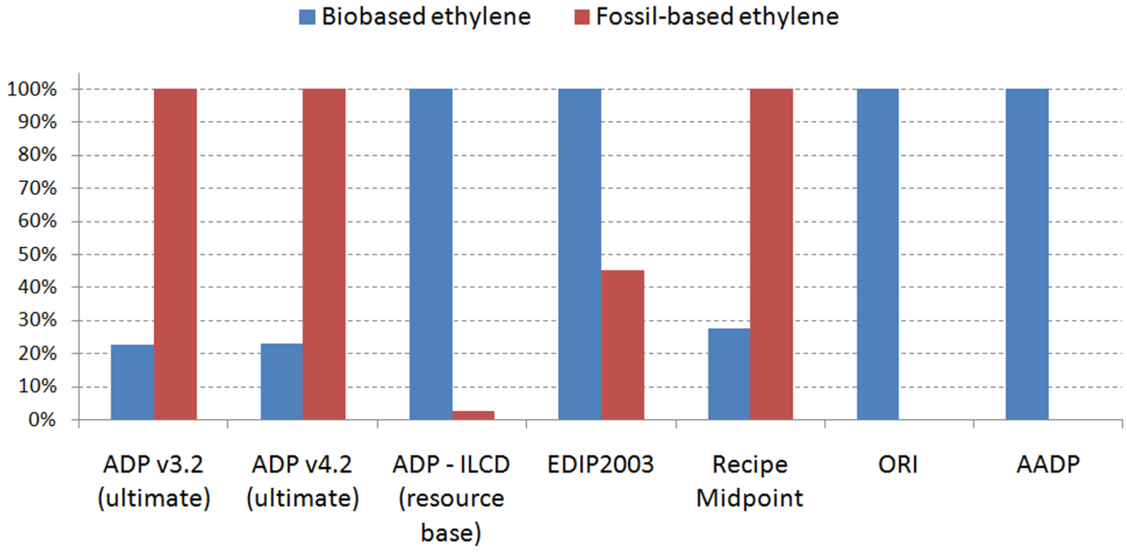 Resource-based assessment of bio-based ethylene and fossil-based ethylene, with different endpoint LCIA methods, normalized to the highest value.