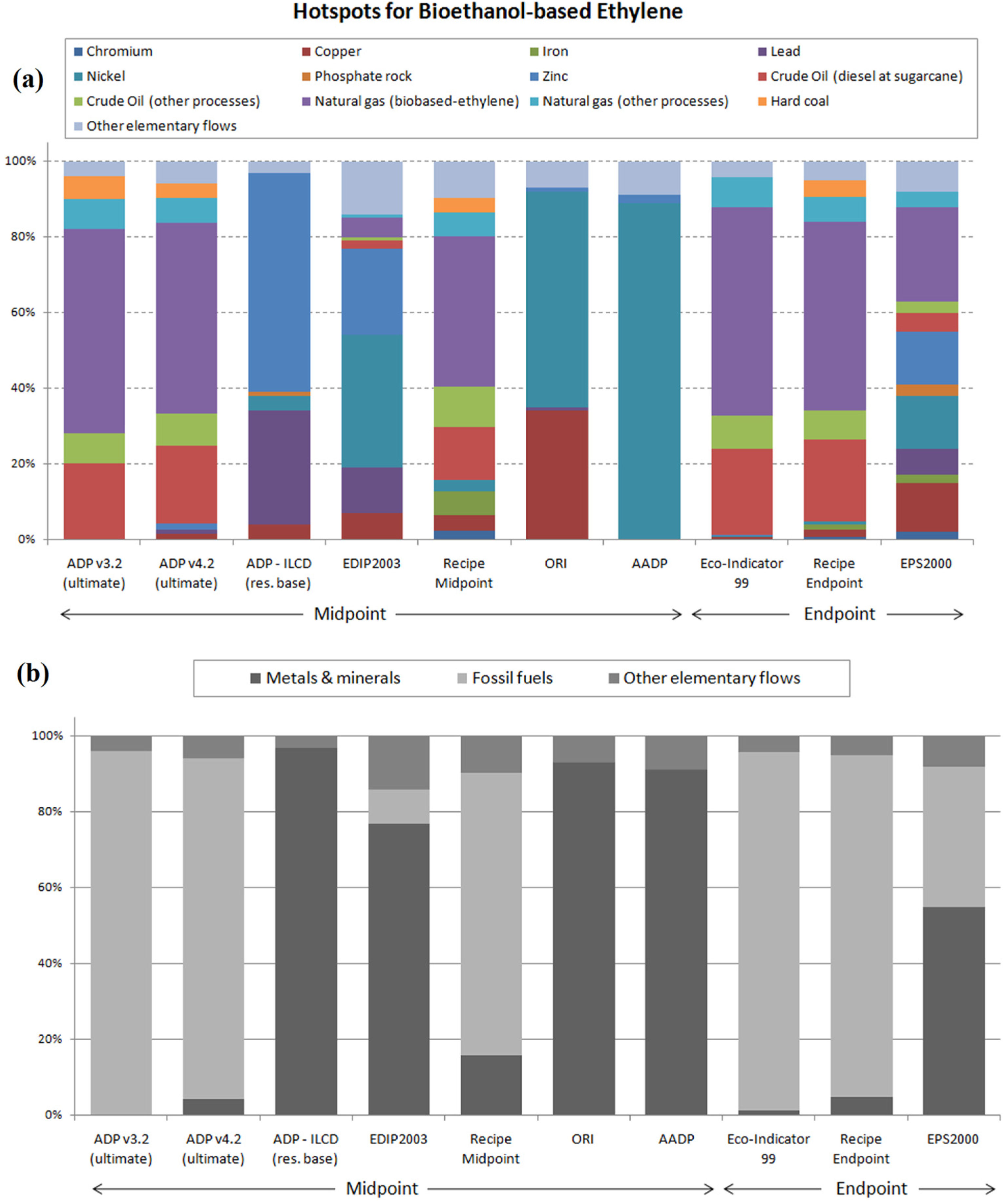 Hotspots from bioethanol-based ethylene with respect to (a) elementary flow level; and (b) type of resource level for midpoint and endpoint LCIA methods.
