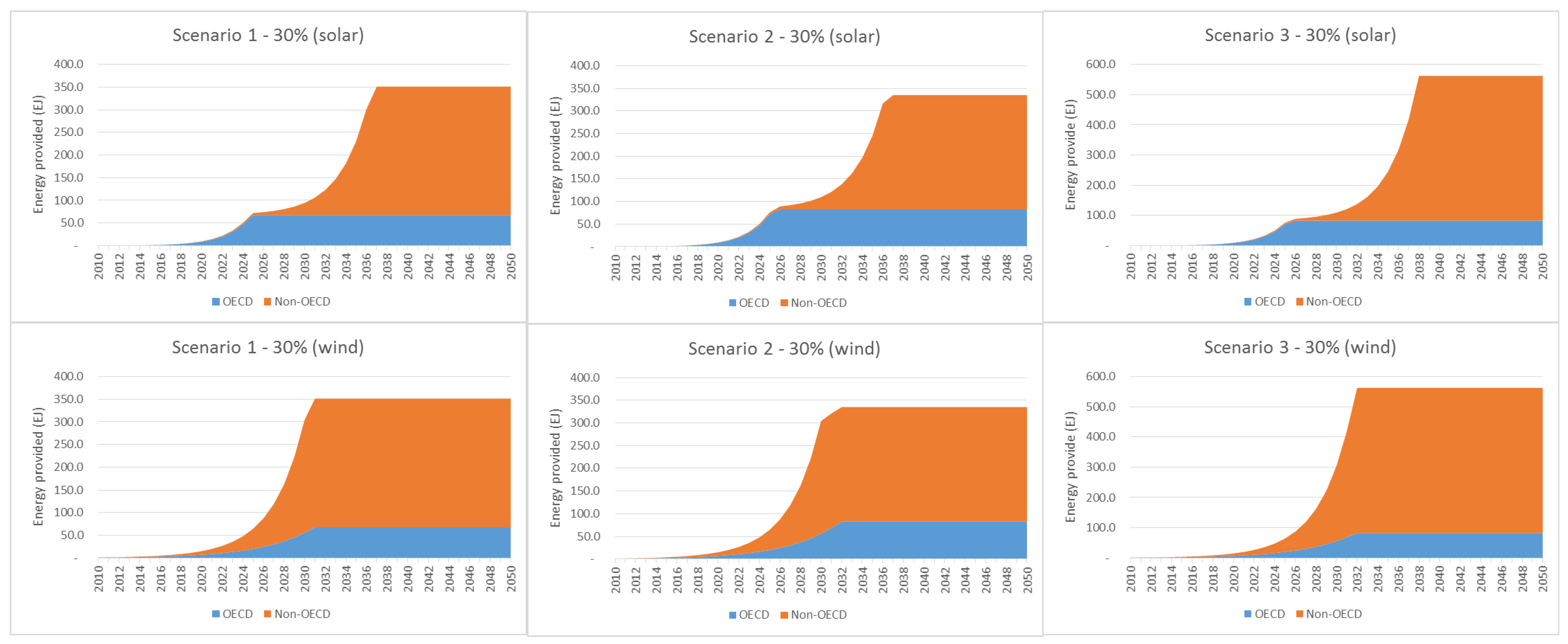 It should be noted that these levels of clean energy uptake are extremely high when compared with most conventional scenarios, but are based on the historic rates of expansion. Moreover, the uptake of solar power (for example) does not differentiate on the basis of technology, so the thin-film technologies considered here (which do not provide more than 10% of the current solar markets) are considered with respect to their potential to provide for the entire solar expansion, whereas they are realistically only one segment of the overall sector.