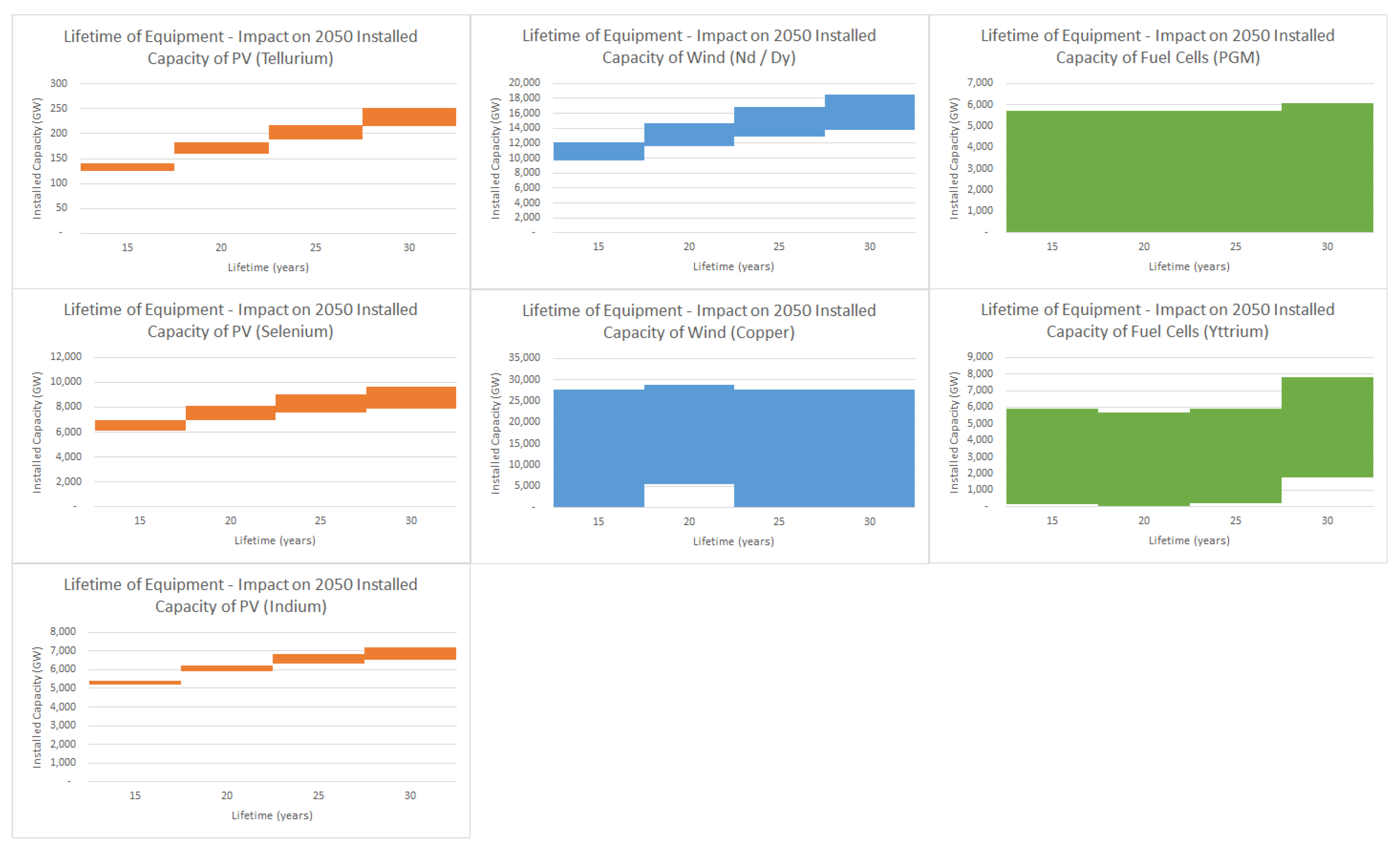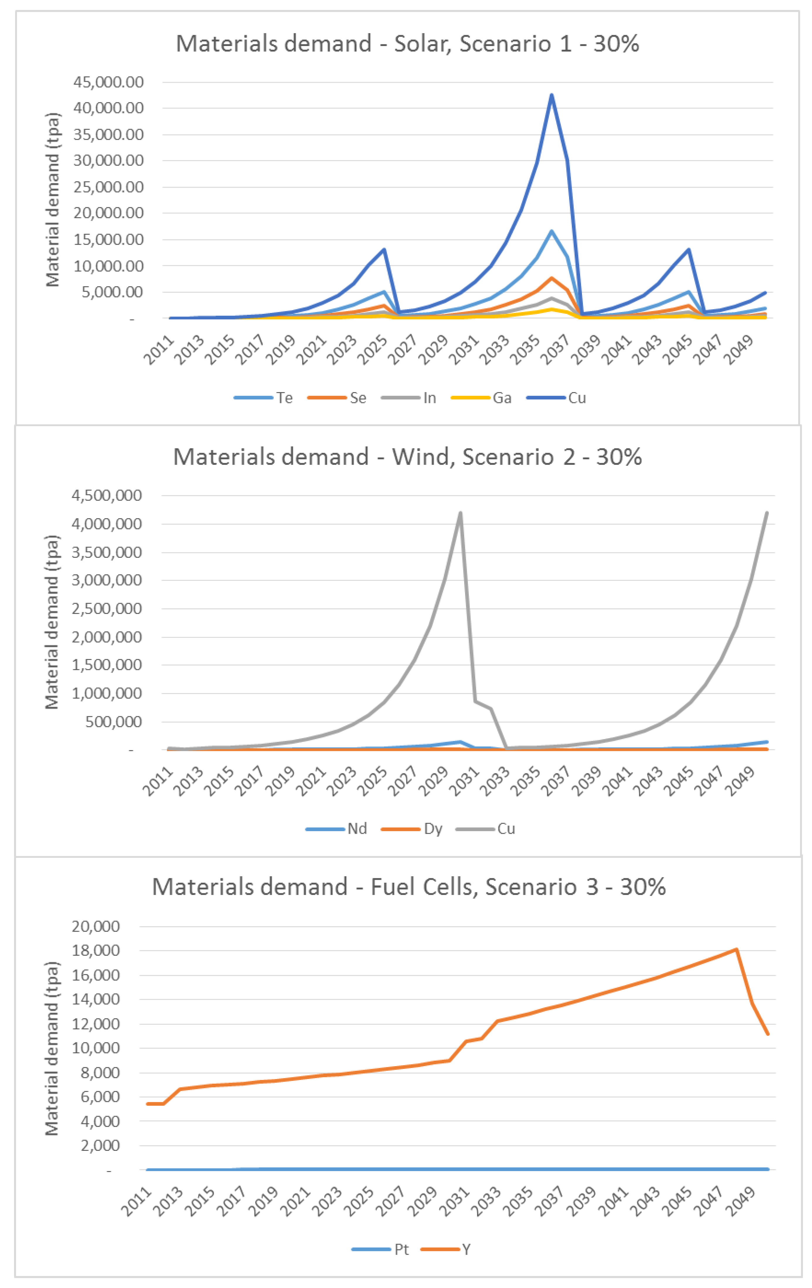 55]. The specific materials of interest were: indium, tellurium, selenium, copper, dysprosium/neodymium, yttrium and platinum. The specific material requirement was applied to each of the technologies, with an assumption of a capacity factor of 15% for solar and 40% for wind in order to obtain the energy output of each unit of installed capacity. In the initial assessment, no consideration was made for technology improvements to reduce materials usage. A lifetime of 20 years is applied to all of the technologies, requiring a replacement of an entire year’s added generation capacity in the 20th year following, in addition to any new capacity growth. While some applications may have longer lives than 20 years, this figure is considered to be reasonable in covering the three technology types considered here. These data were compared with materials supply scenarios to identify whether any shortages might be expected.