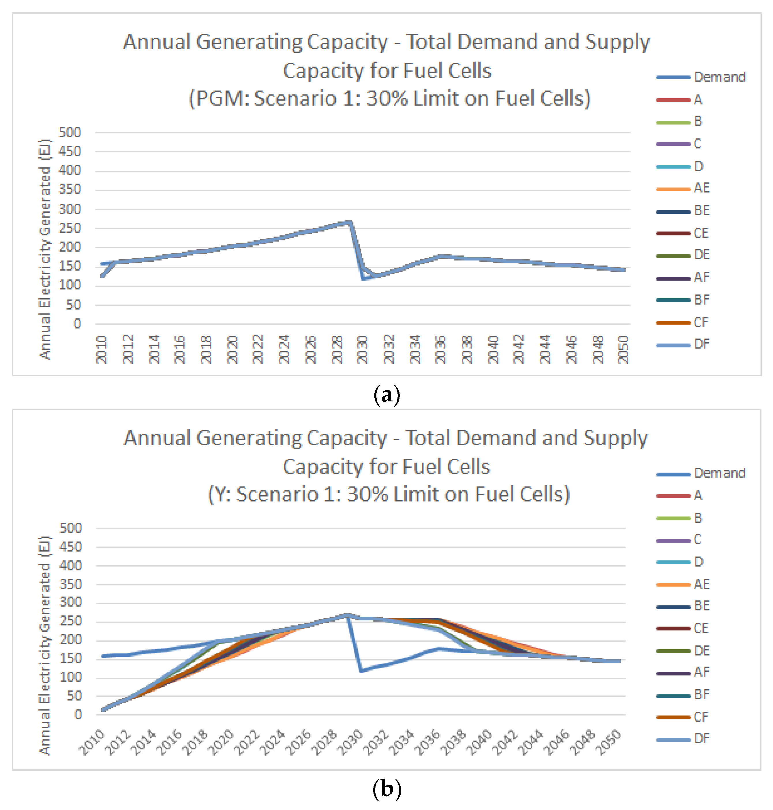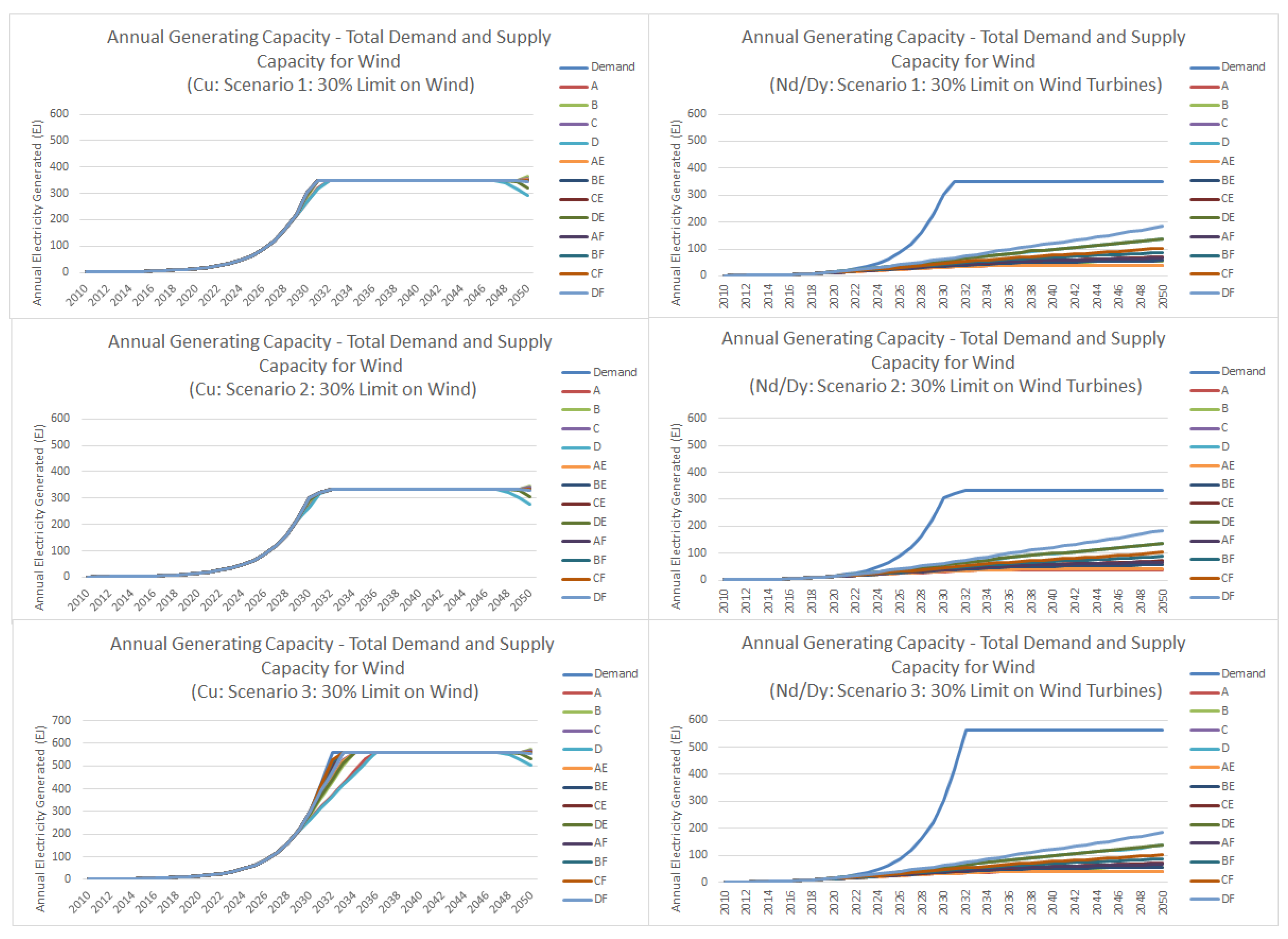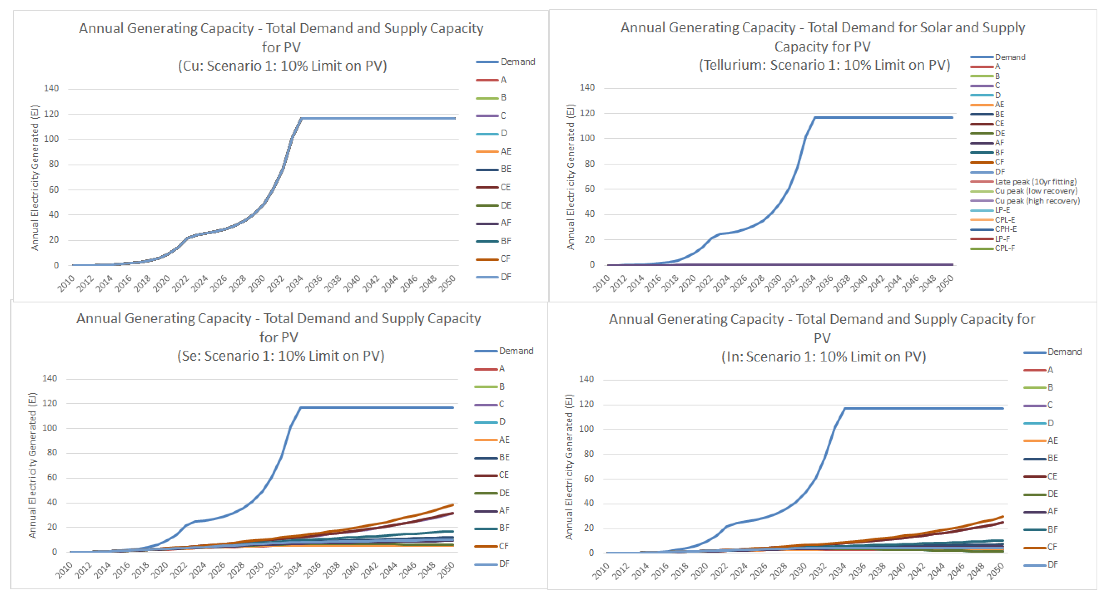 The results of the two scenario processes, supply and demand, were combined in order to determine whether shortfalls in critical minerals could be expected in the future. The combination of the supply and demand scenarios is used to provide a series of potential energy supply paths for each technology. In the case of no limitations, these supply paths under each mineral supply scenario will mirror the theoretical demand. In the case where demand exceeds supply, all of the supply of the mineral for the year will be used to produce the energy technology, and the limit in added capacity will become the real added capacity under that mineral supply scenario. Supply cannot exceed demand, except in cases where the theoretical energy demand declines over time, and the dynamics of the model mean that the decommissioning process will occur only at the end of the technology lifetime (20 years).
