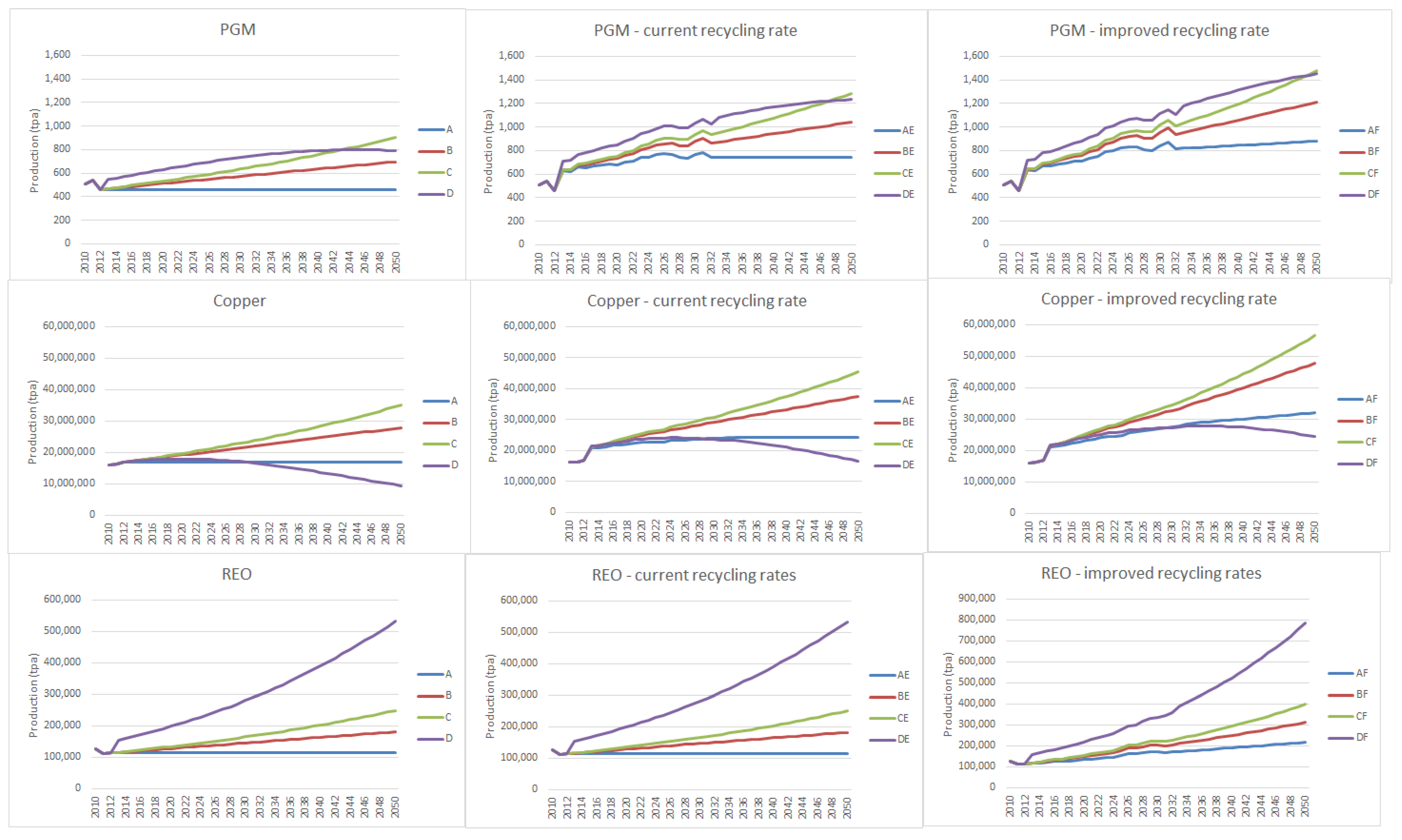 Table 7 shows the change in annual production of each mineral from the beginning to the end of the period of interest for each of the scenarios. It is apparent that recycling is important in increasing the rate of production (or reducing the amount of the decrease). The effectiveness of recycling in increasing supply is highly influenced by three factors: the basis rate of recycling, the assumed rate of increase of the recycling rate to the final 90% (scenarios F) and the rate of change of production in the base case. Those metals starting from a low basis recycling rate do not see as great an increase in production as metals with a higher recycling rate, due to the compounding effects of recycling of materials after 20 years, which accumulate faster under the higher recycling rate.